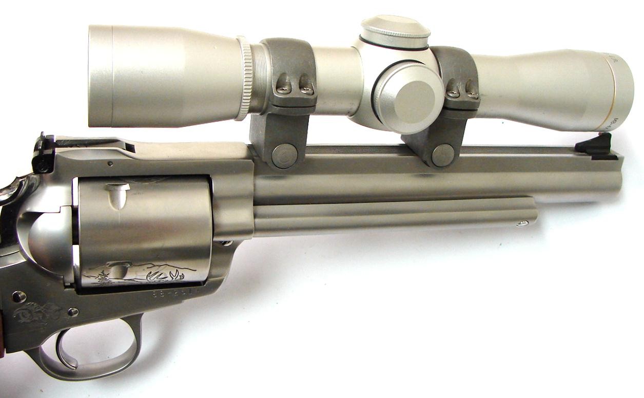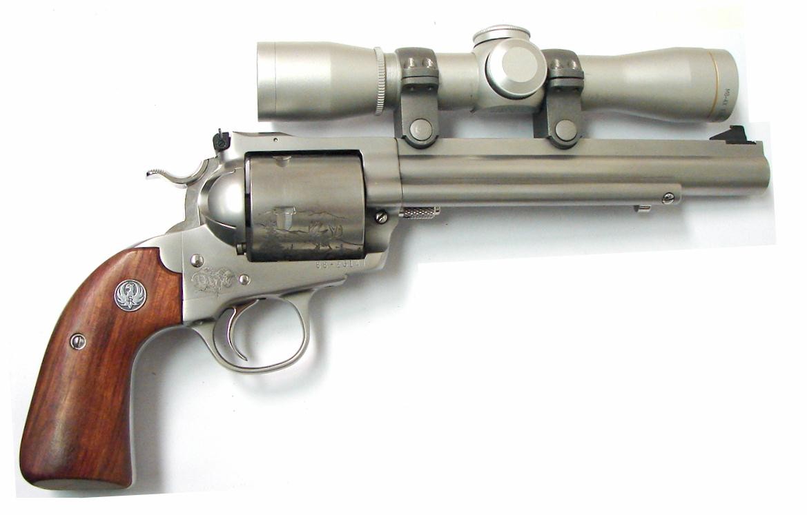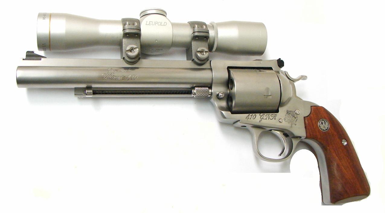 Gary Reeder Ultimate 410 .410 GNR caliber revolver. Gary Reeder Custom Bisley Blackhawk model, converted to .410 GNR caliber. Has typical Reeder upgrades. Engraving, polishing, special parts and action work. A great example of a big bore custom six gun with Leupold 4X scope. Excellent condition.