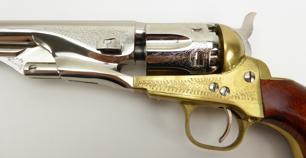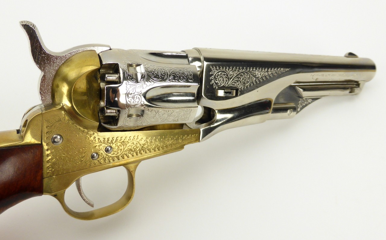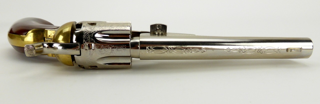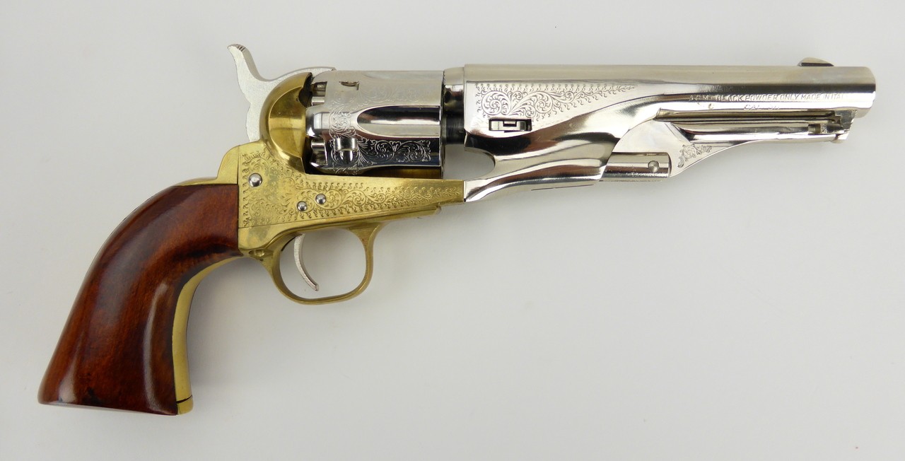 Armi San Marco Deluxe Edition 1862 Police .36 caliber Blackpowder revolver. Engraved and nickel plated, with flask and case.