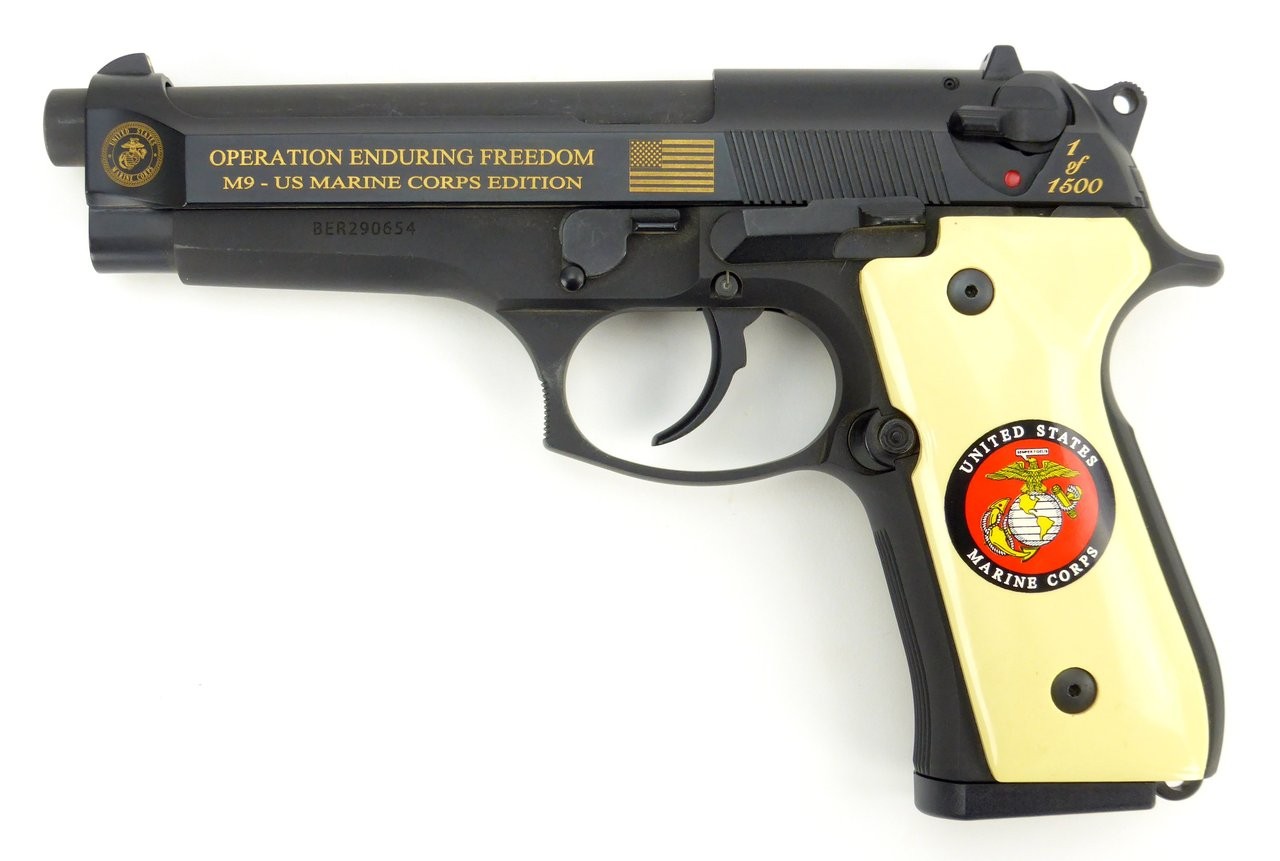 Beretta 92FS 9mm Para caliber pistol. Operation Enduring Freedom USMC Edition highly decorated with fancy grips.