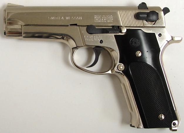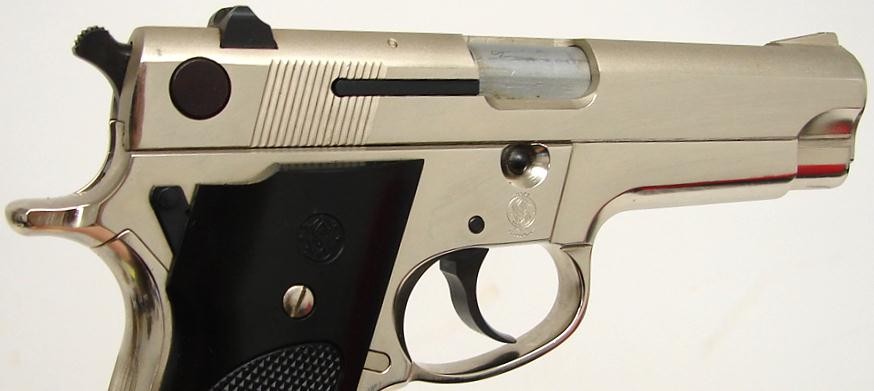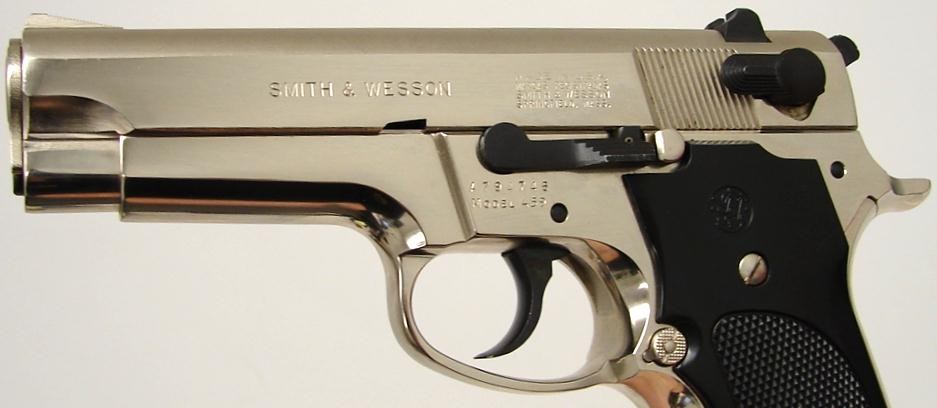 Smith & Wesson 459 9mm caliber pistol. Factory nickel model in excellent condition.