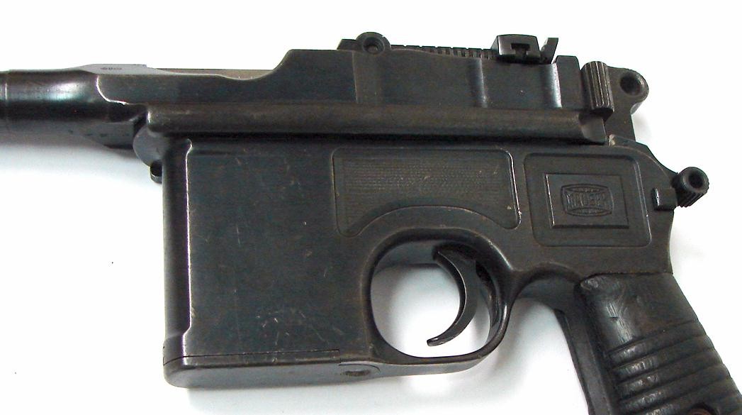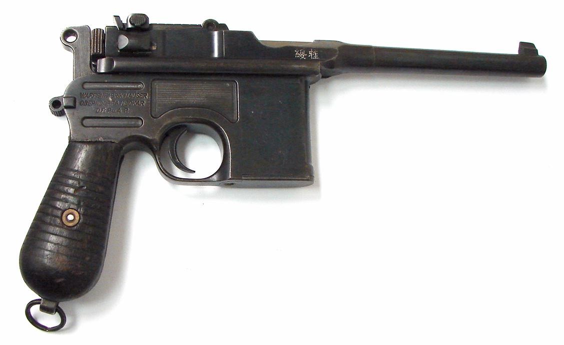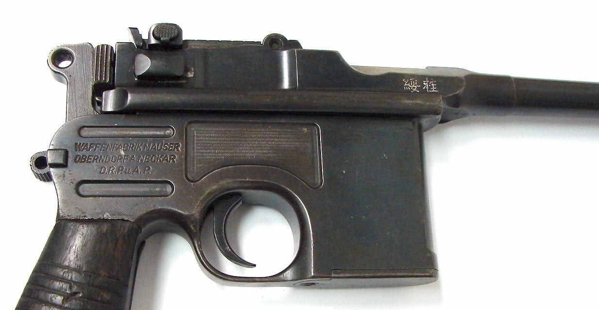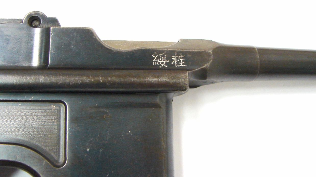 Mauser 1930 Commercial .30 caliber pistol. Late 1930s production. Sold to China with Chinese markings on the right side. Matching serial numbers. Good grips. The bore has strong rifling and is dark in the grooves. About 80% finish with patina and some pitting on the grip frame. Very good overall condition especially for a Chinese issue pistol.