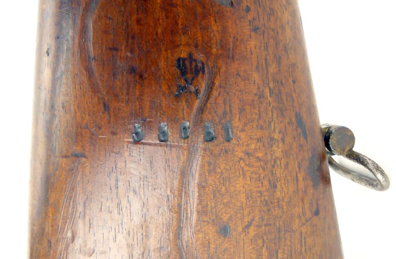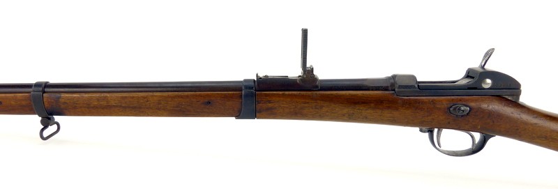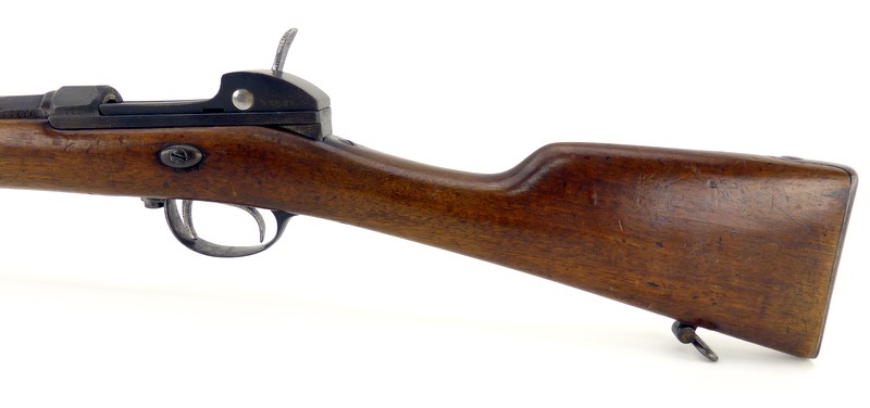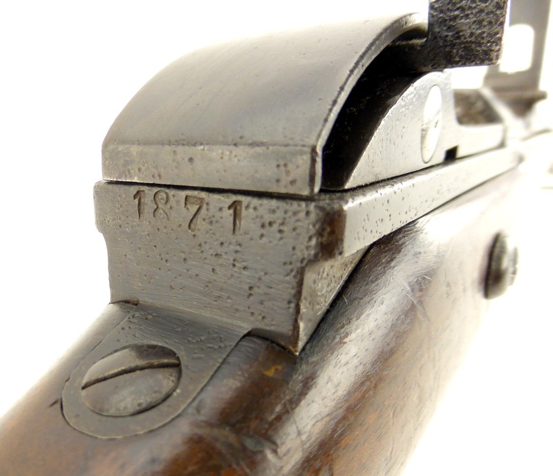Werder M69 11x60 caliber Infantry rifle. "Aptiertes" model. Baverian rifle converted to shoot the Mauser 1871 cartridge. Has the M71 rear sight. Excellent bore. All matching, crown marked stock. Overall patina finish. Bands show some pitting, but match, This is a very hard gun to find in this market. Has the correct chrome hammer, 1871 marked. Very hard to find.