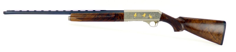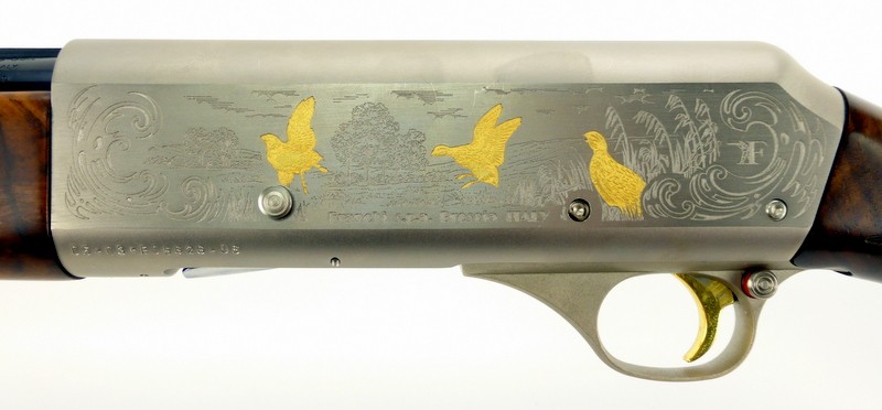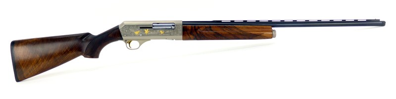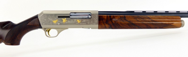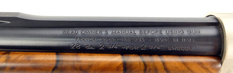 Franchi Fenice 28 gauge shotgun. Lightweight semi-auto in scarce 28 gauge. Has engraved and gold inlaid silver receiver and fancy walnut. 26" barrel.