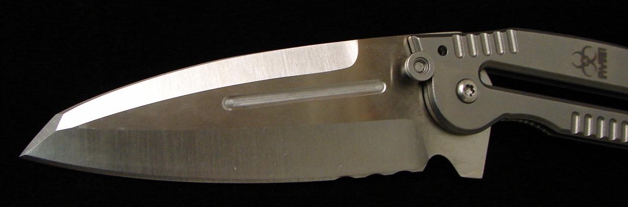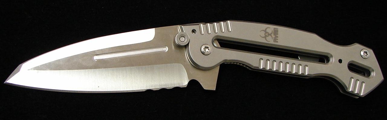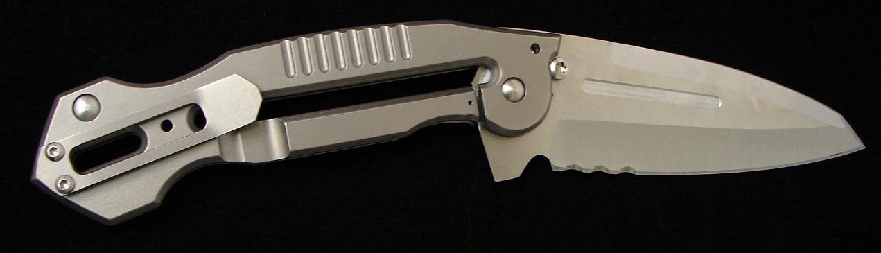 Steve Ryan Large Framelock Folder. Monster-sized folding knives like this Ryan should not carry so light in the pocket, yet this knife succeeds. Easy to flip and fold, this beast has a 5” tanto-like S530V blade, with a mean grind job. Titanium frame in a satin finish has cut a ways for extra light weight reproduction. Very tight lockup thanks to the frame lock. Tip up carry. Overall length is a whopping 11” with a closed length of 6 5/8”. This knife looks like something out of an alien movie yet feels great, and is strangely easy to carry, making it a stout EDC knife that is ready to roll when you are. This is a fantastic knife in excellent condition.
