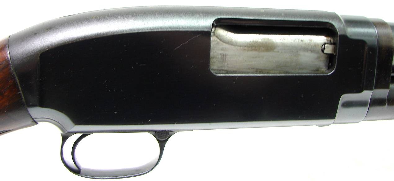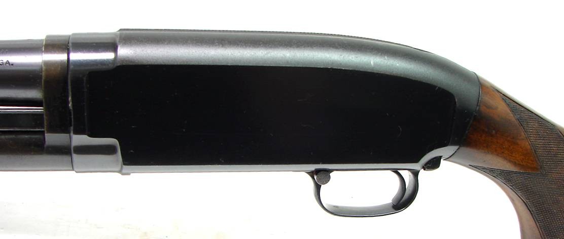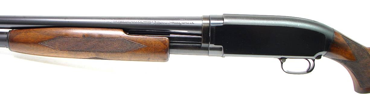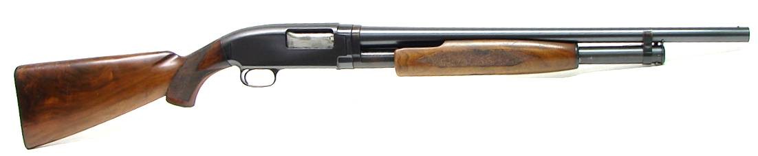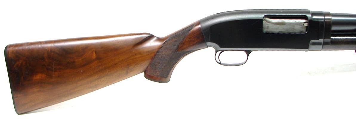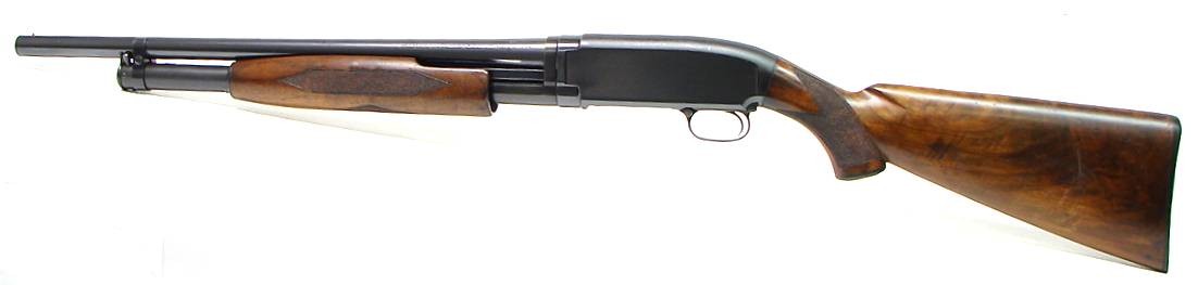 Winchester 12 12ga caliber shotgun. Model 12 riot gun. This is or was a deluxe model 12 that was altered (barrel cut) (W4635)
