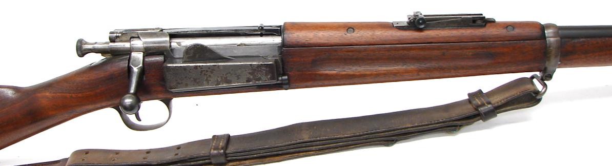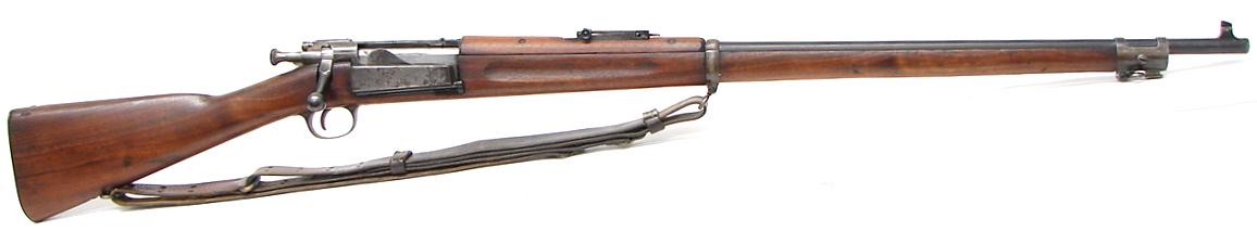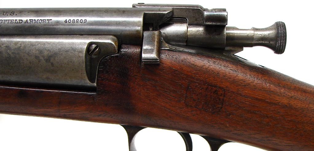 Springfield 1898 .30-40 Krag caliber rifle. U.S. Army issue. Good bore with very strong rifling and dark in the grooves. Stock is very good with a faint but visible cartouche. Barrel blue is very good. has a Rock Island sling dated 1908 and J.H.S. inspected. Overall rifle is very good.
