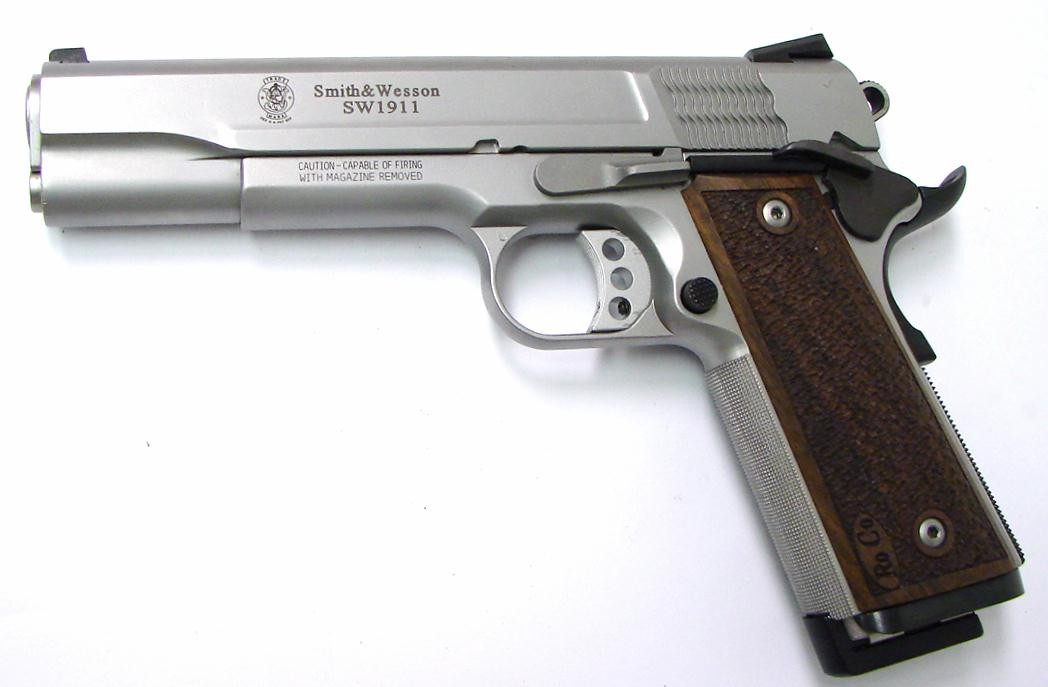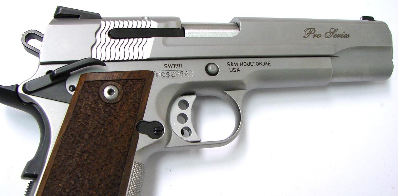Smith & Wesson 1911 Pro Series 9mm caliber pistol. Stainless model with wood grips. New.