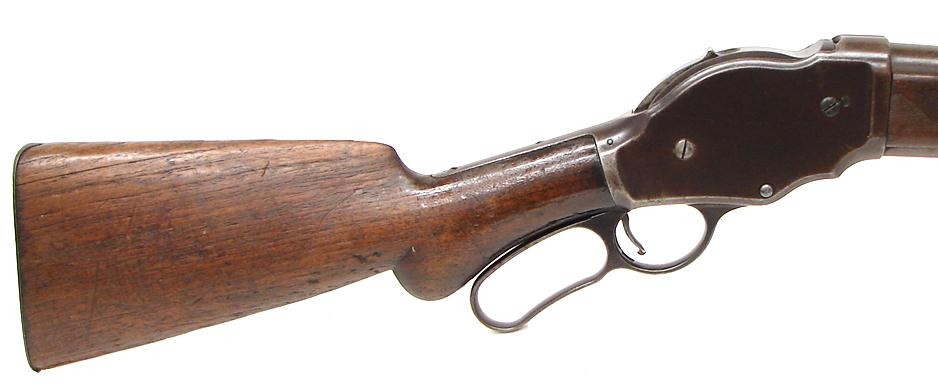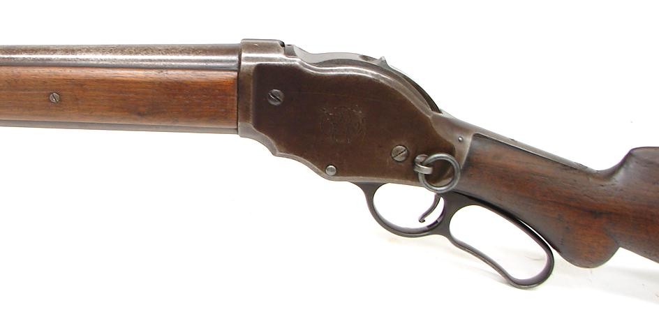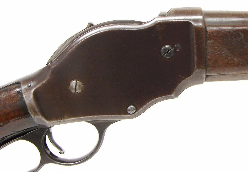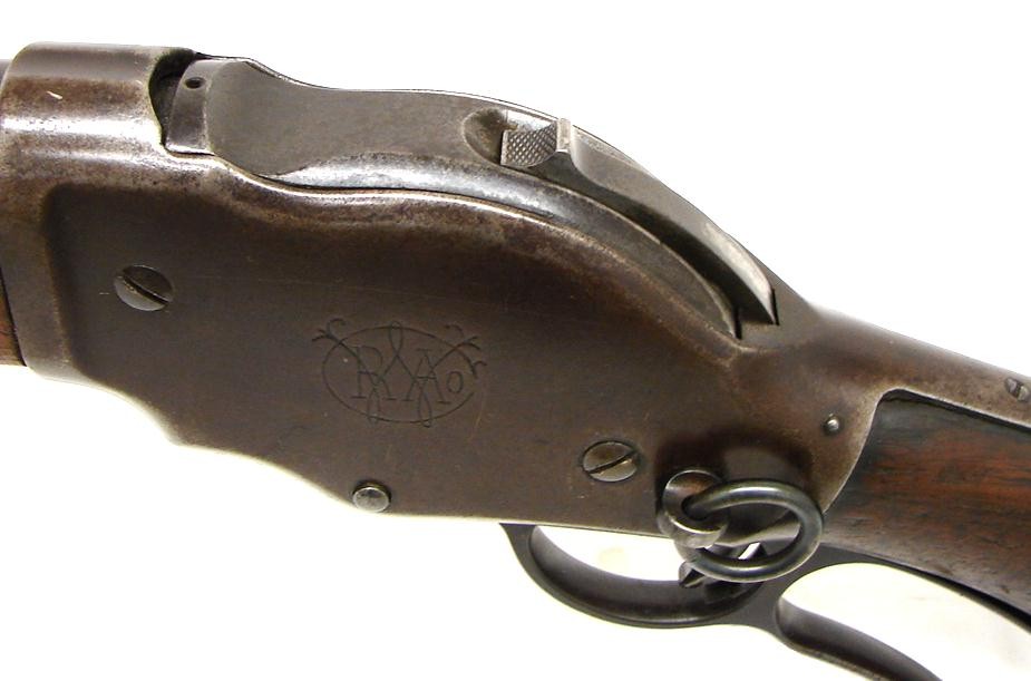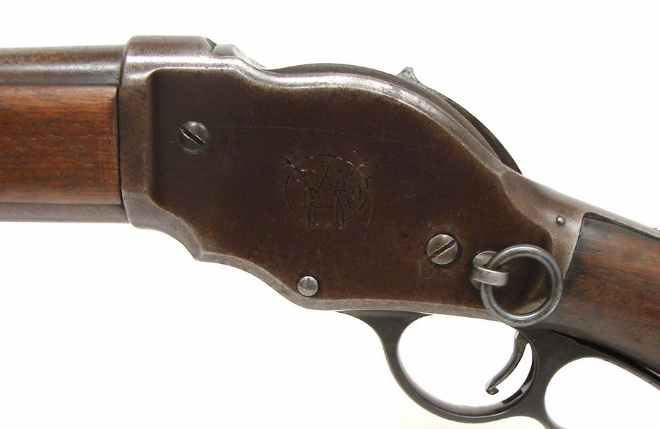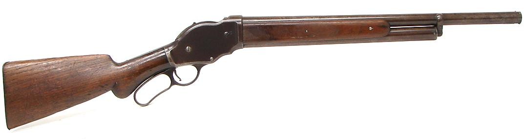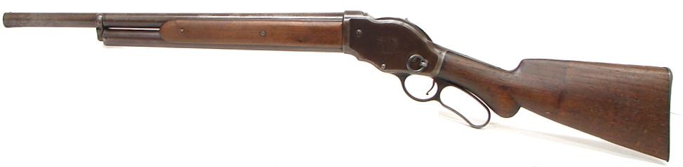 Winchester 1887 12 gauge shotgun. Barrel has been shortened to 21 and has a saddle ring. Action works perfectly. Has a smooth patina finish. This is a neat looking Old West shotgun. Wyatt Earp wished he had this at O.K. Corral.
