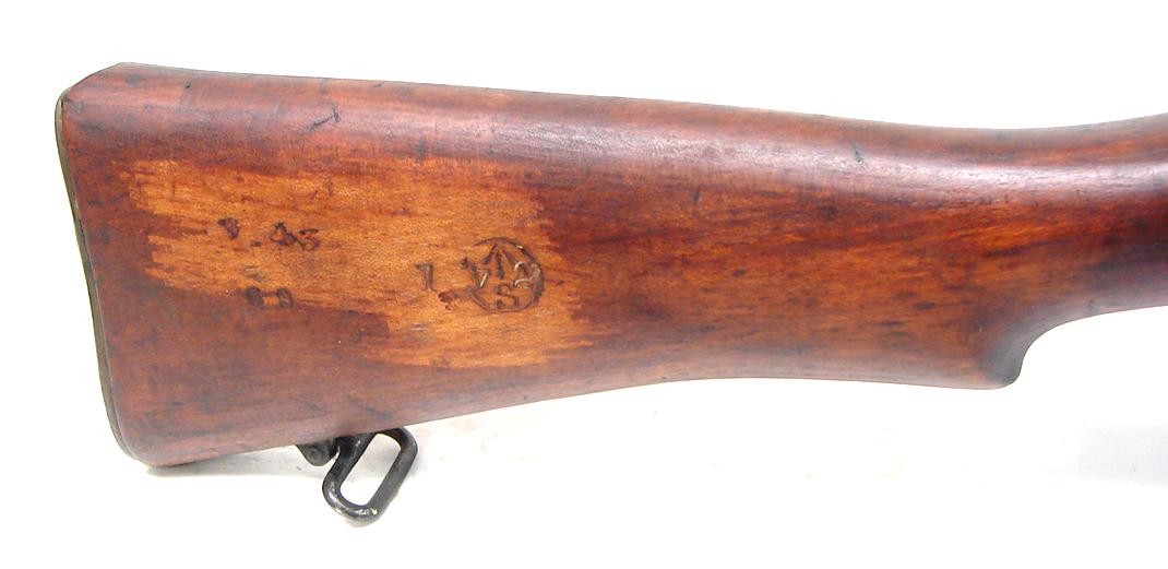 Enfield No. 1 MK III .303 British caliber rifle. 1943 production in India. Matching serial numbers including the magazine. Excellent bore. Excellent forend. The butt stock has a repair at the toe and heel. The handguard shows some age cracking. About very good over all condition.