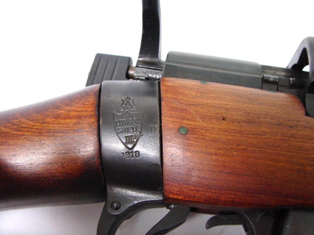 Lithgow Arsenal No. 1 MK III .303 British caliber rifle. Produced during 1918 in Australia. It has been arsenal refurbished at some point. Excellent bore. The wood is about excellent and the forend has a minor crack on the left side above the trigger. Matching serial numbers. About excellent over all condition.