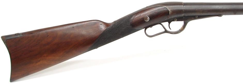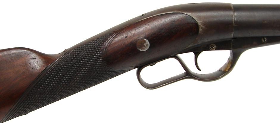 Whitney-Howard Single Shot shotgun. Made by Whitney Arms under Charles Howards patent. These were only made a few years in the 1870s-1880s. This gun is in nice shape with 40% of the original blue mixed with a nice smooth patina. The wood is nice as well. There is a brass weld on the lever where it was repaired long ago.