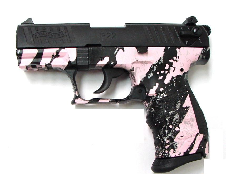 Walther P22 .22 LR caliber pistol with pink tiger stripe finish. Comes with tools, extra front sights, extra back straps and one magazine. New. Price may change without notice.