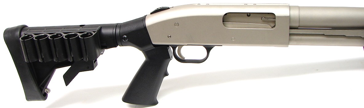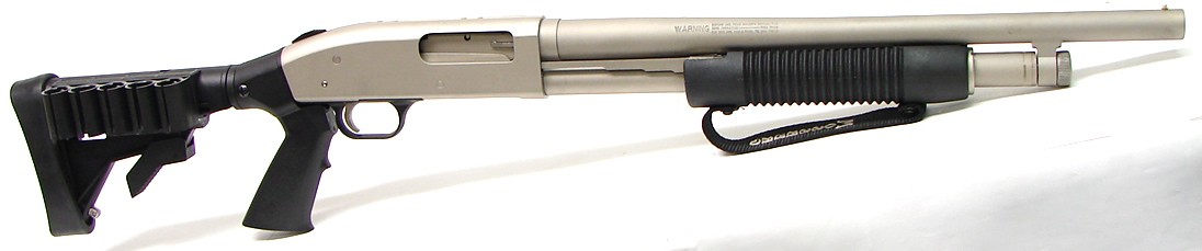 Mossberg 500 12 gauge shotgun. Marine Coat model with 18" barrel and collapsible stock with pistol grip. New.