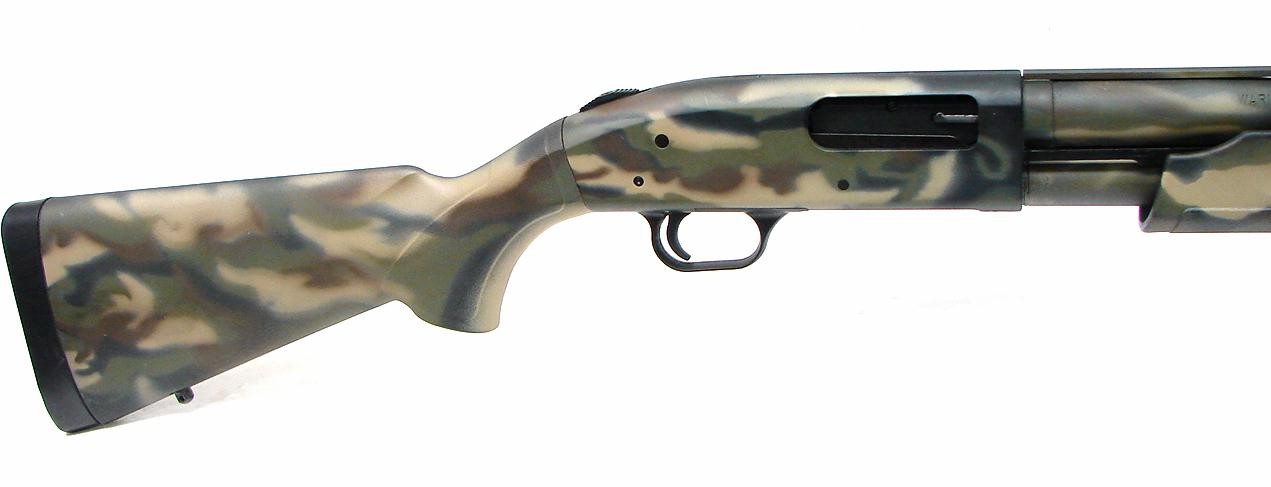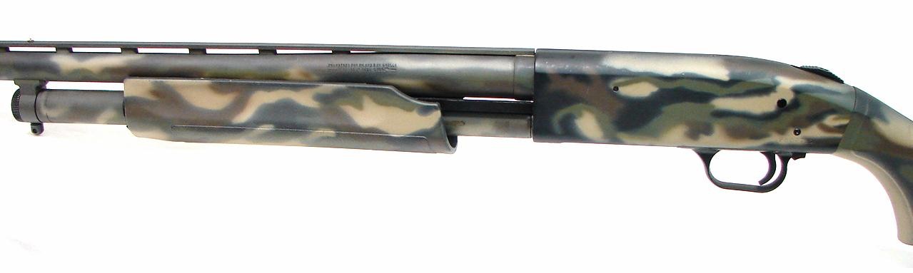 Mossberg 500A 12 gauge shotgun. 28" barrel model with custom camo finish.