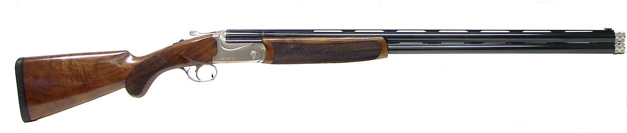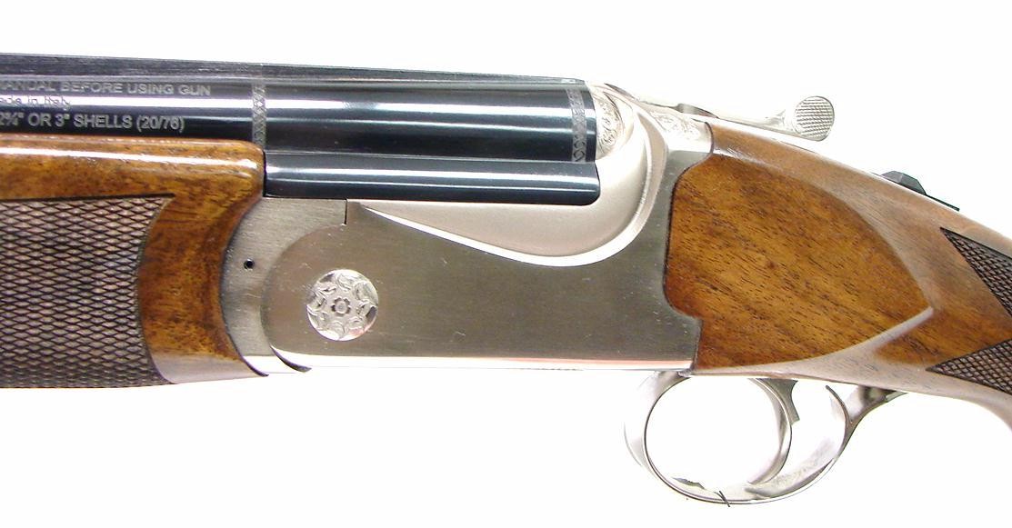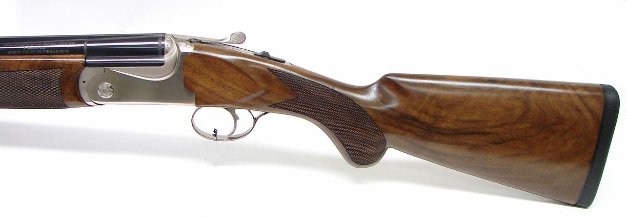 Deluxe over/under with beautiful walnut stock. Receiver and locks are engraved with floral motifs. Barrels are 26".Length of pull is 14.5". UPC:082442...