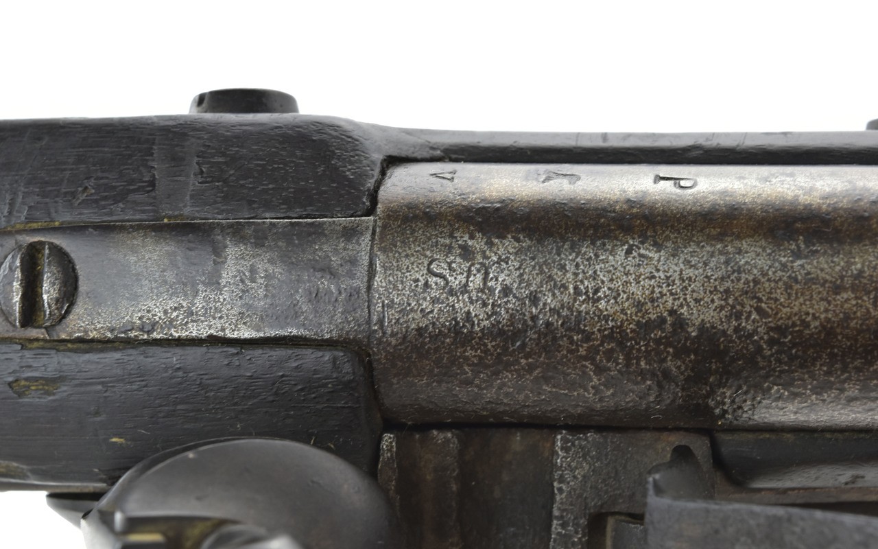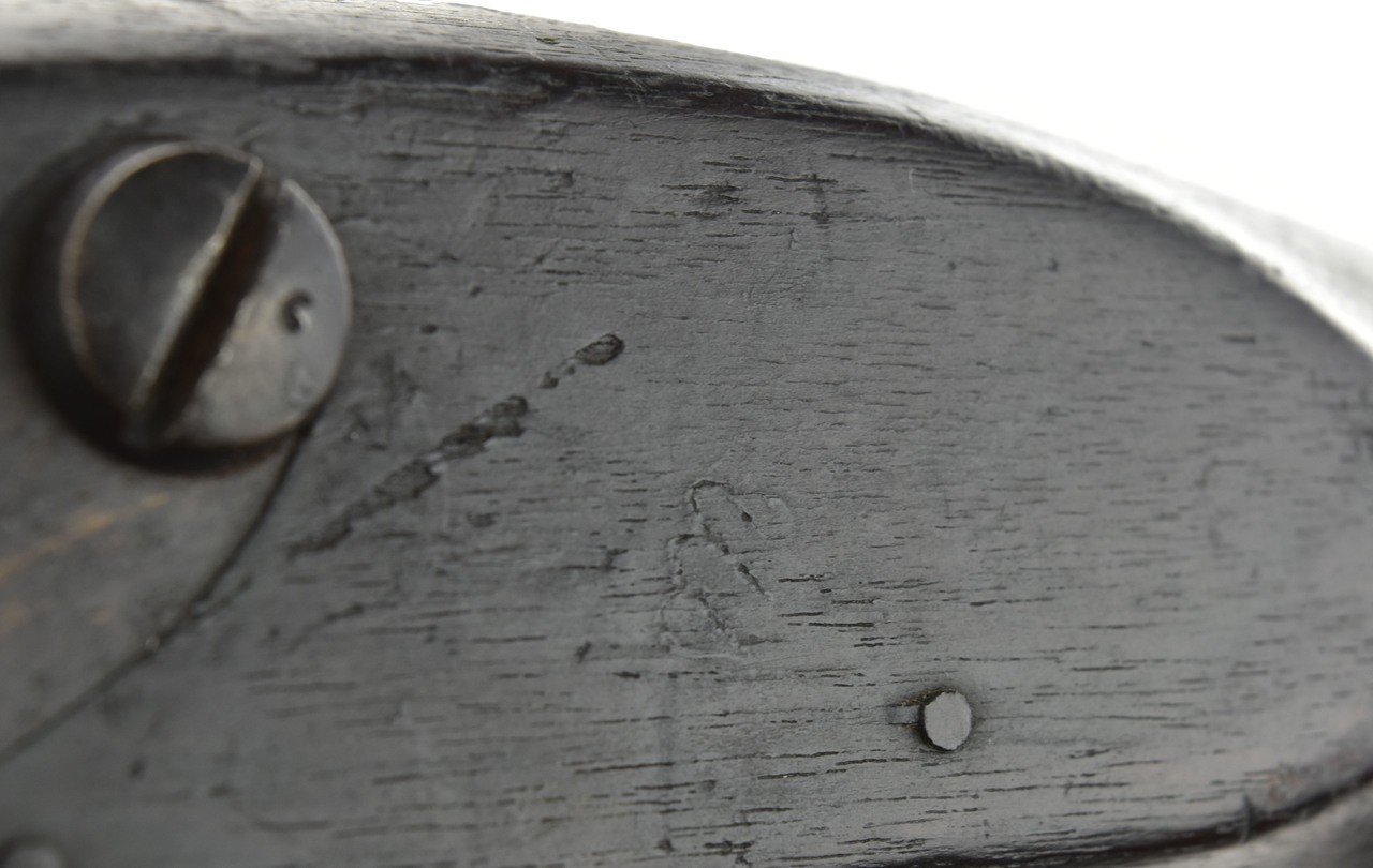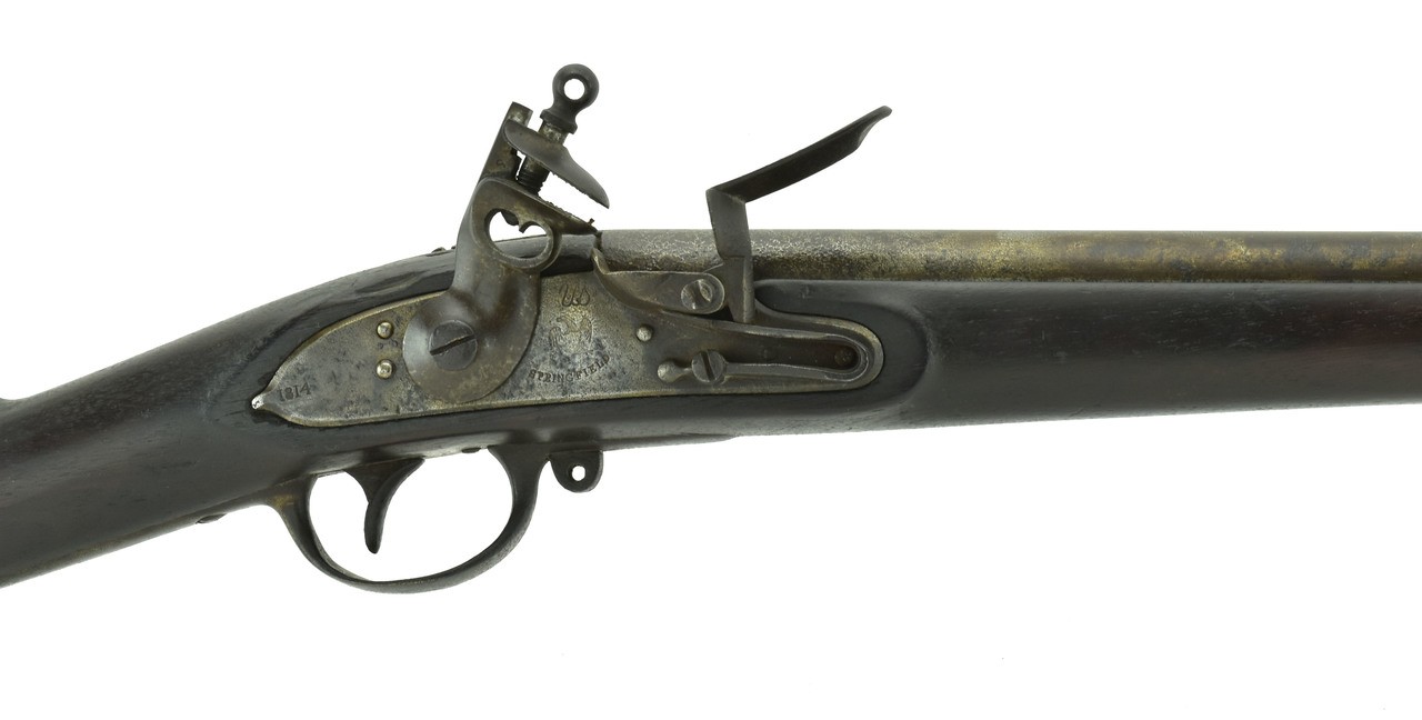 Scarce U.S. Springfield Model 1812 Type I flintlock musket. Metal has a brown patina. Lockplate is dated 1814. Production totals for the Type I are 10,000. Stock shows handling wear and usage. Faint “US” cartouche is present. Overall a good scarce Type I.