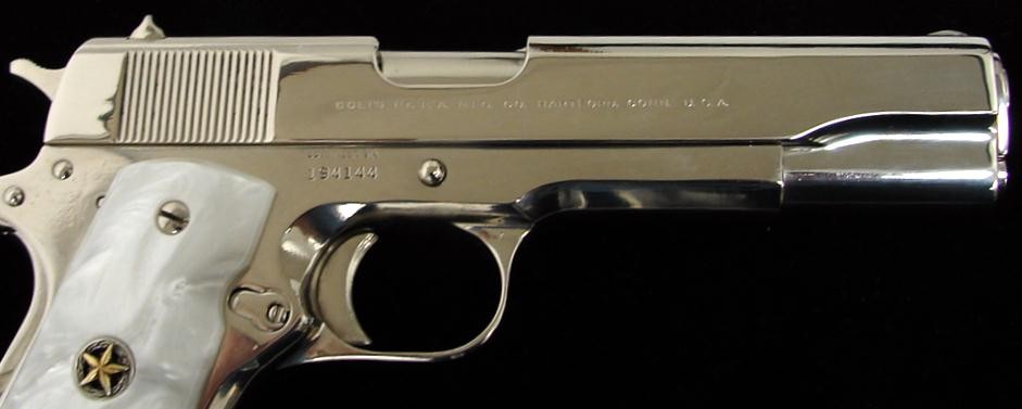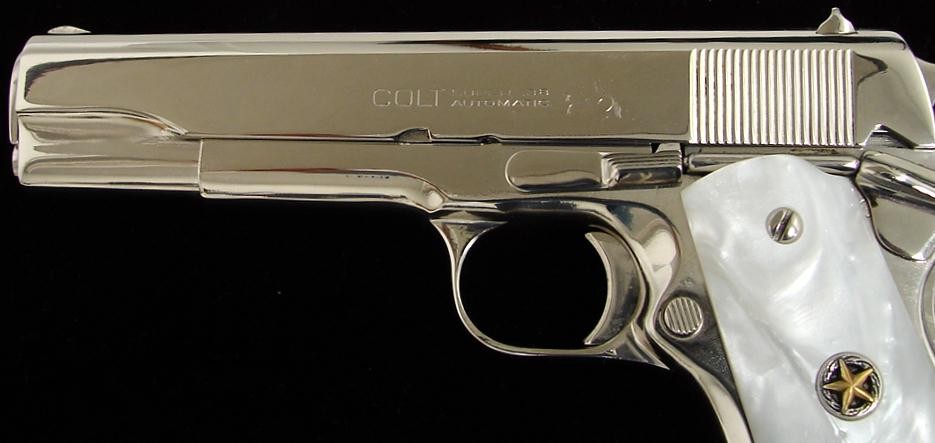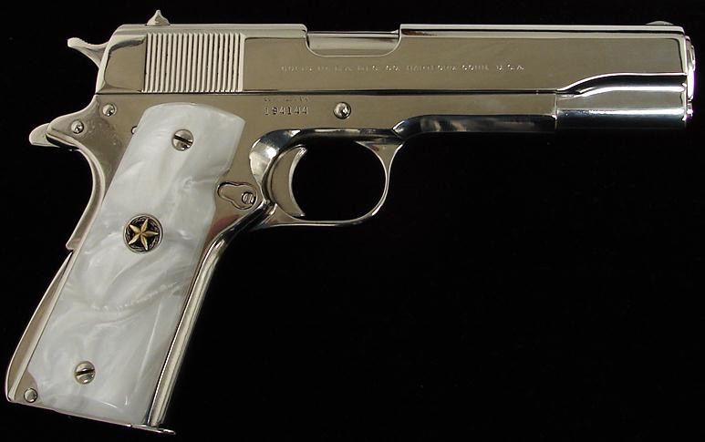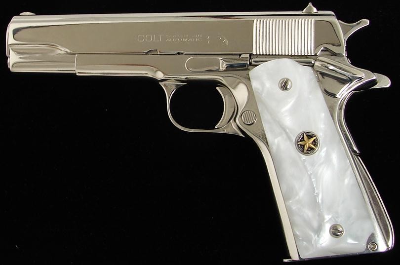 Colt Super 38 .38 Super caliber pistol. 1960s vintage model with custom nickel finish and fancy grips.