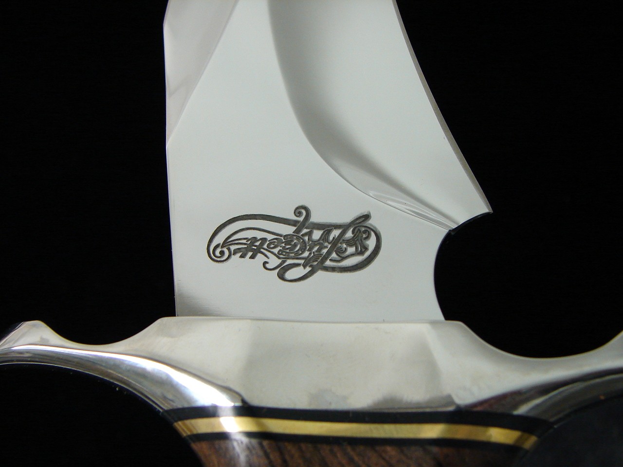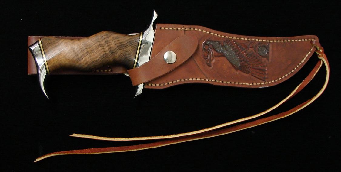 Bill Luckett of Weatherford, TX Nighthawk. 8 7/16” 440C blade in mirror polish. 13 3/4” overall length with 4 3/4” cocobolo handle from hilt to pommel. Beautiful knife from the part-time Texas maker. Handle has brass spacers. Both sides are razor sharp! Custom fitted and made sheath embossed with an eagle. Great price for a fantastic knife!