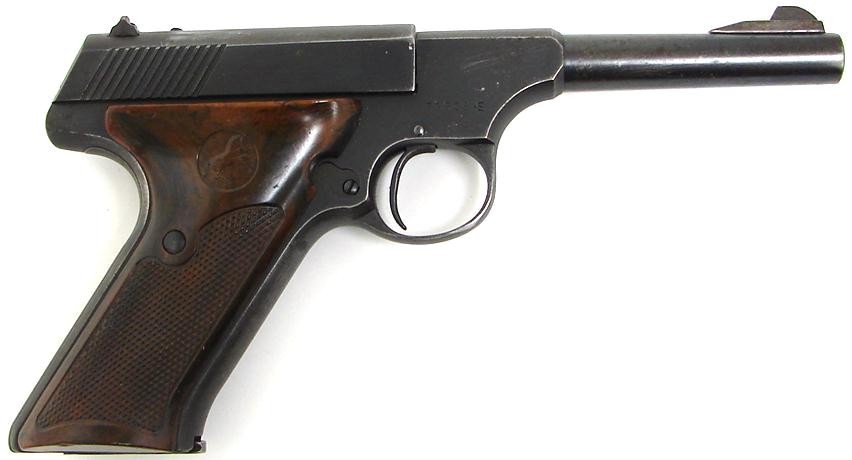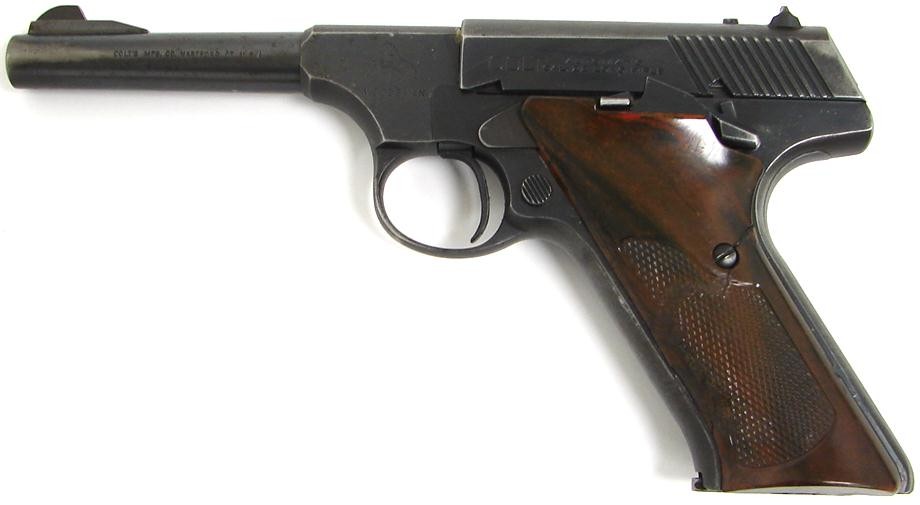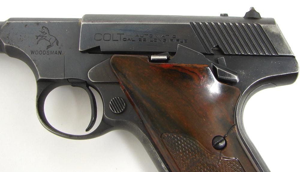 Colt Woodsman 2nd Series .22 LR caliber pistol with button magazine release. Grips are cracked & repaired.