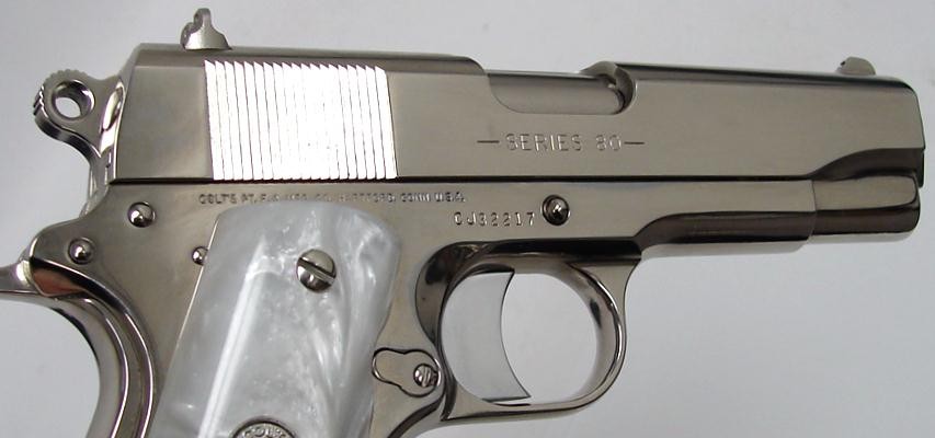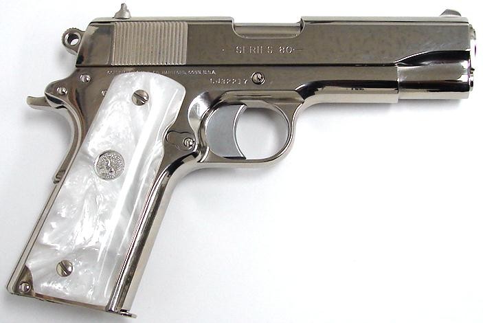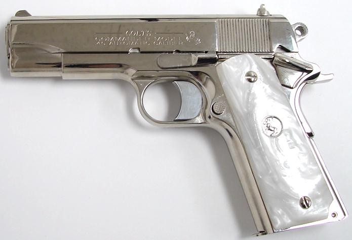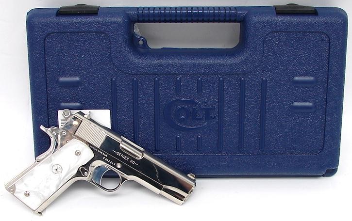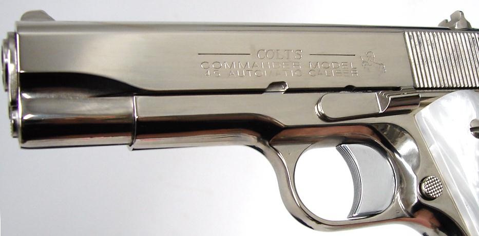 Colt Commander .45 ACP caliber pistol. Classic model with custom nickel finish and fancy grips. New.
