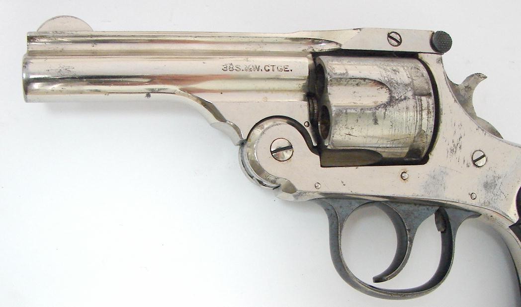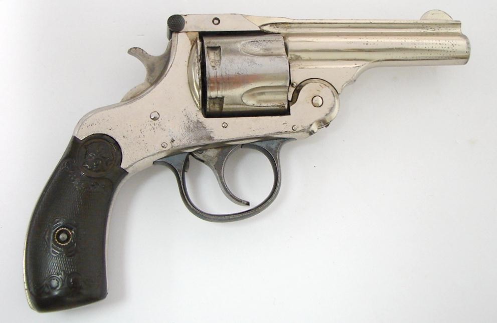Harrington & Richardson Top Break .38 S&W caliber. Bore is fair with some corrosion but gun does not show a lot of wear. Gun has about 96-97 % original nickle. Action works fine. Gun has replaced Iver Johnson grip that fits well but not prefectly on the right side. Left side grip is the correct Harrington & Richardson grip.