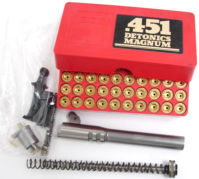 Detonics .451 Magnum conversion kit for 5 1911 pistol. Like new condition with box, papers & 50 round brass. Rare.