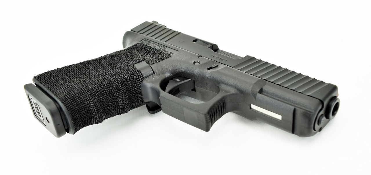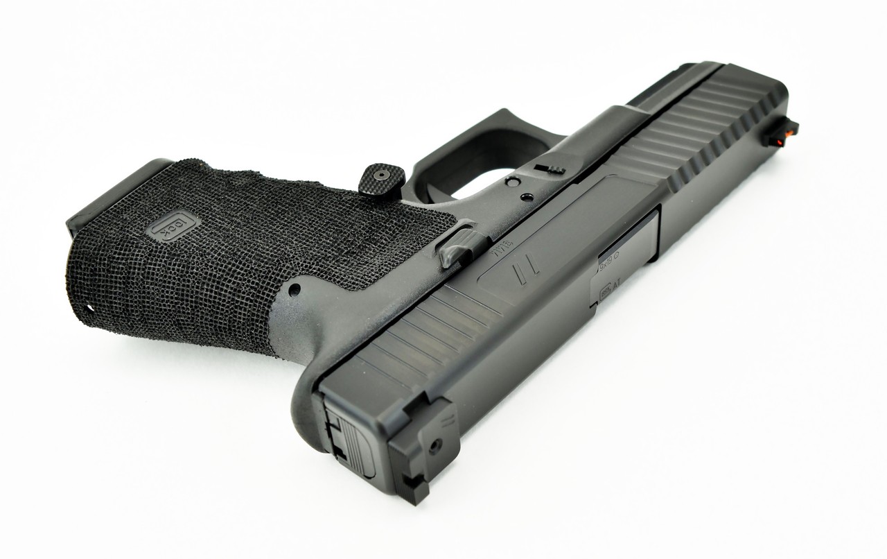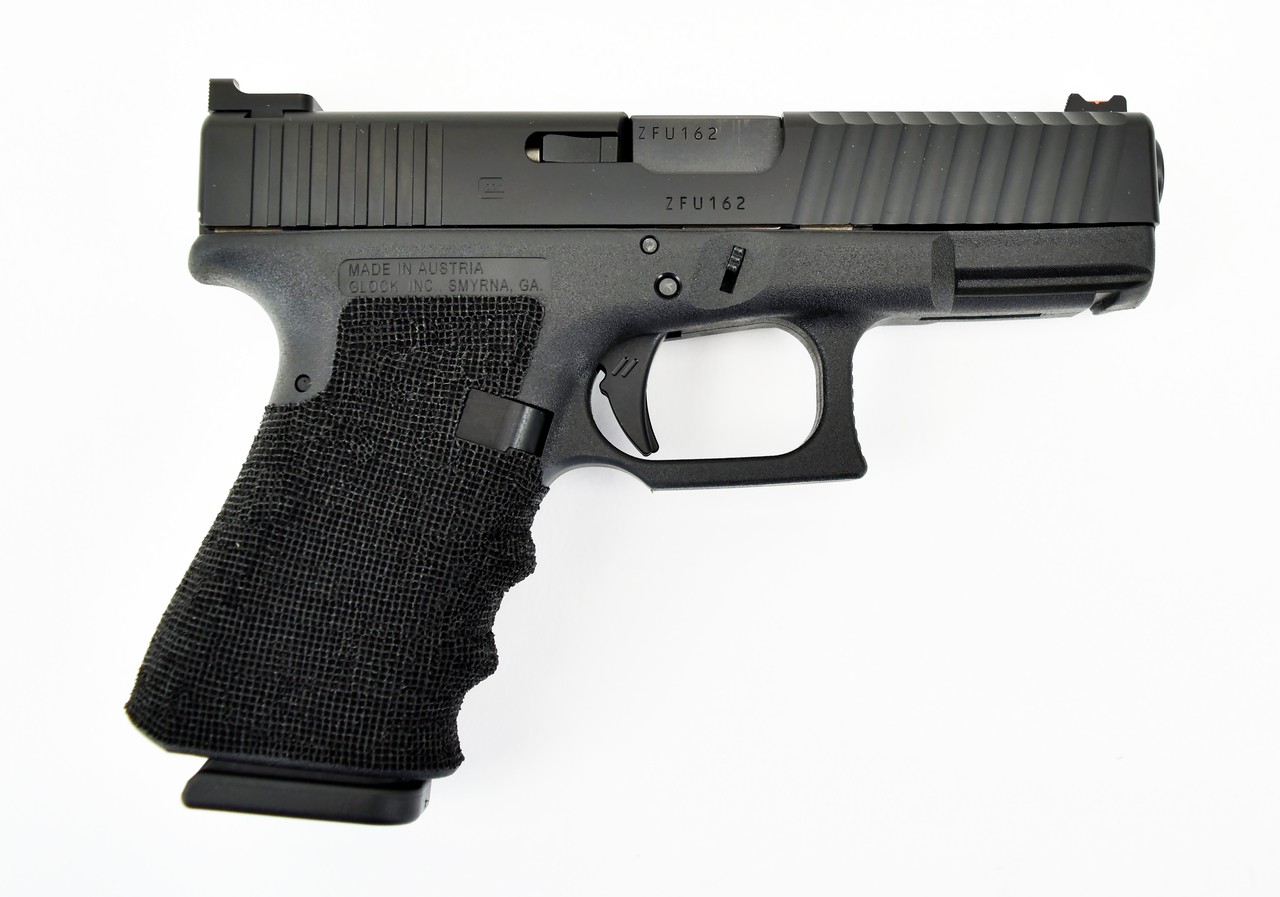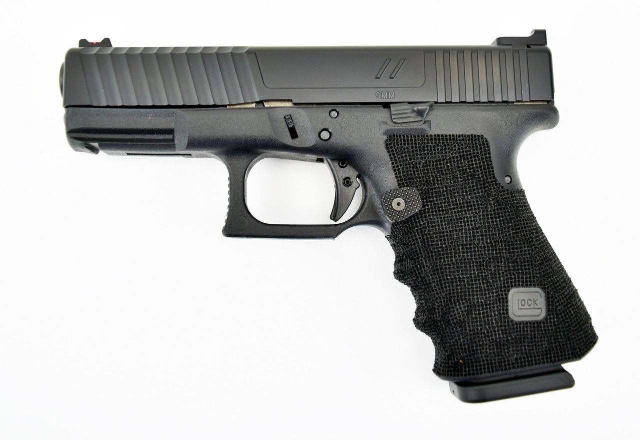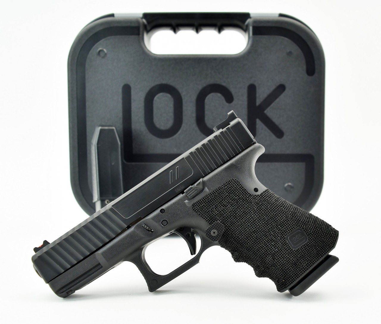 Glock 19 Zev 9mm caliber pistol. Zev custom defender model with upgraded trigger, grip stippling, slide cuts, extended mag release and fiber optic front sight. New