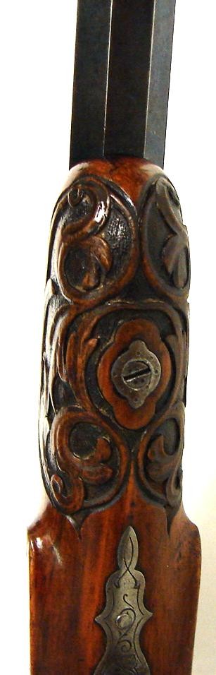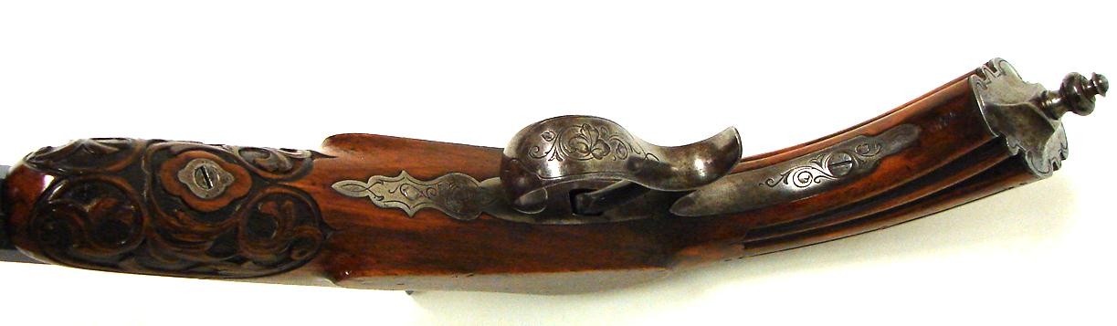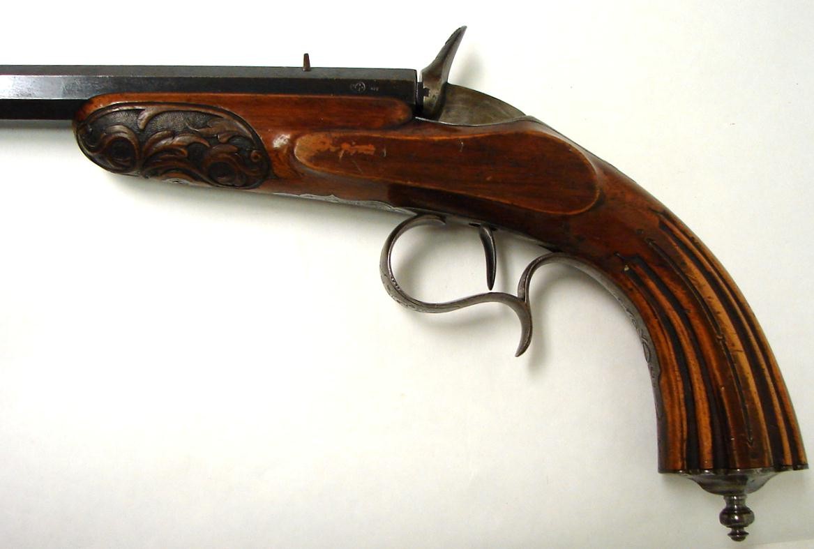 Belgian Flobert System Target pistol. 5.5 MM caliber. Bore is very good stock is well carved. Barrel has about 93-94% blue. Barrel length 9 1/4" and overall length is 15".