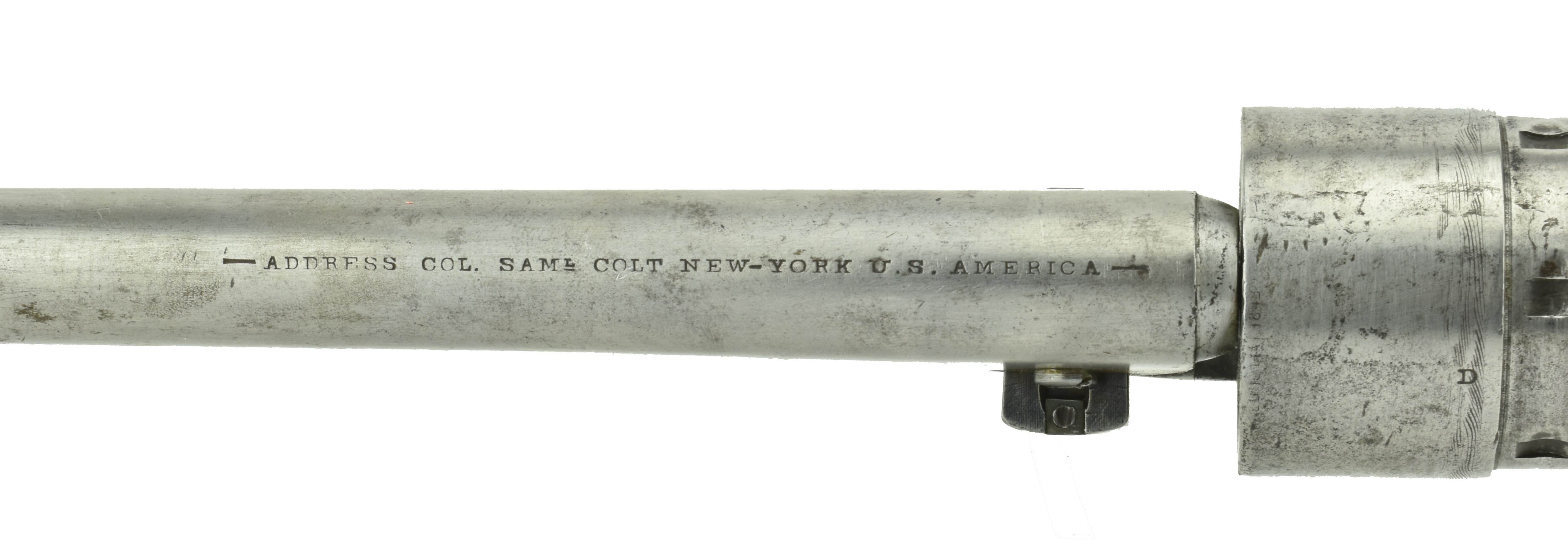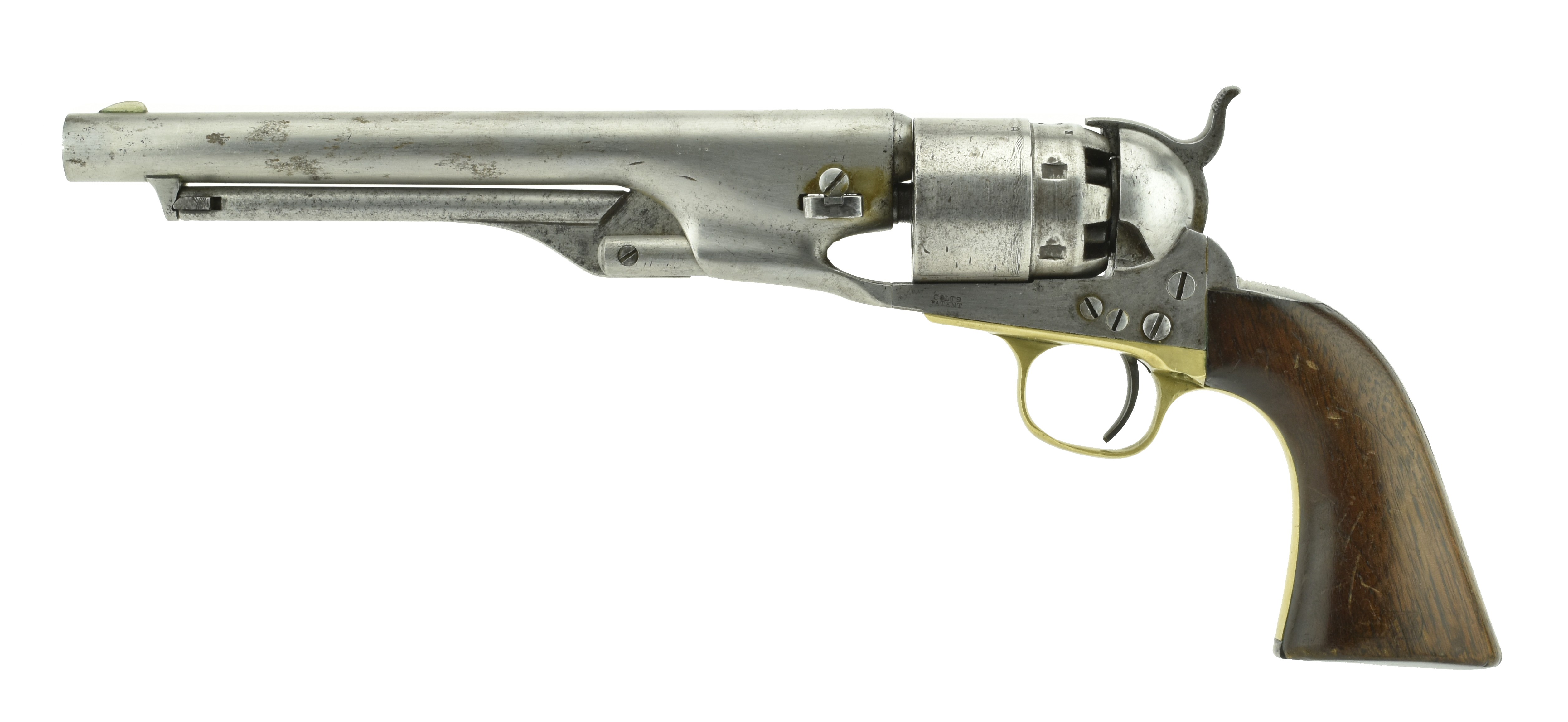 Colt 1860 Army Caliber Revolver. Made in 1862. Nice sharp gun that has been cleaned. Gun is all matching. Traces of the cylinder scene are visible. This gun is a little unusual since it is a 4-screw frame in the 45,000 serial number range while the 3-screw frame became the norm in the 33,000 serial number range. Grips are very fine with sharp cartouches.