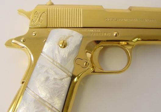 Colt 70 Series gold plated 45 caliber pistol with fancy pearl grips.