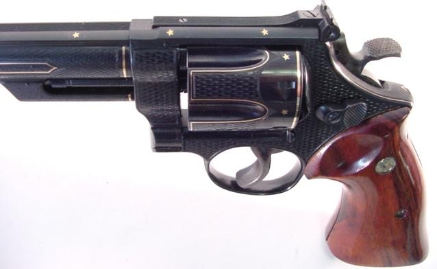 Smith & Wesson Model 29 custom engraved 44 Magnum caliber revolver with gold inlay.