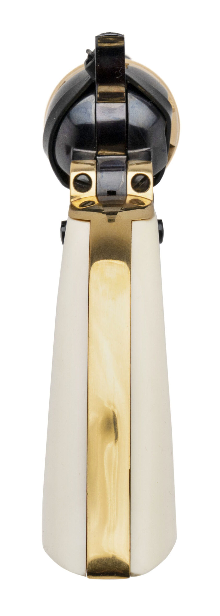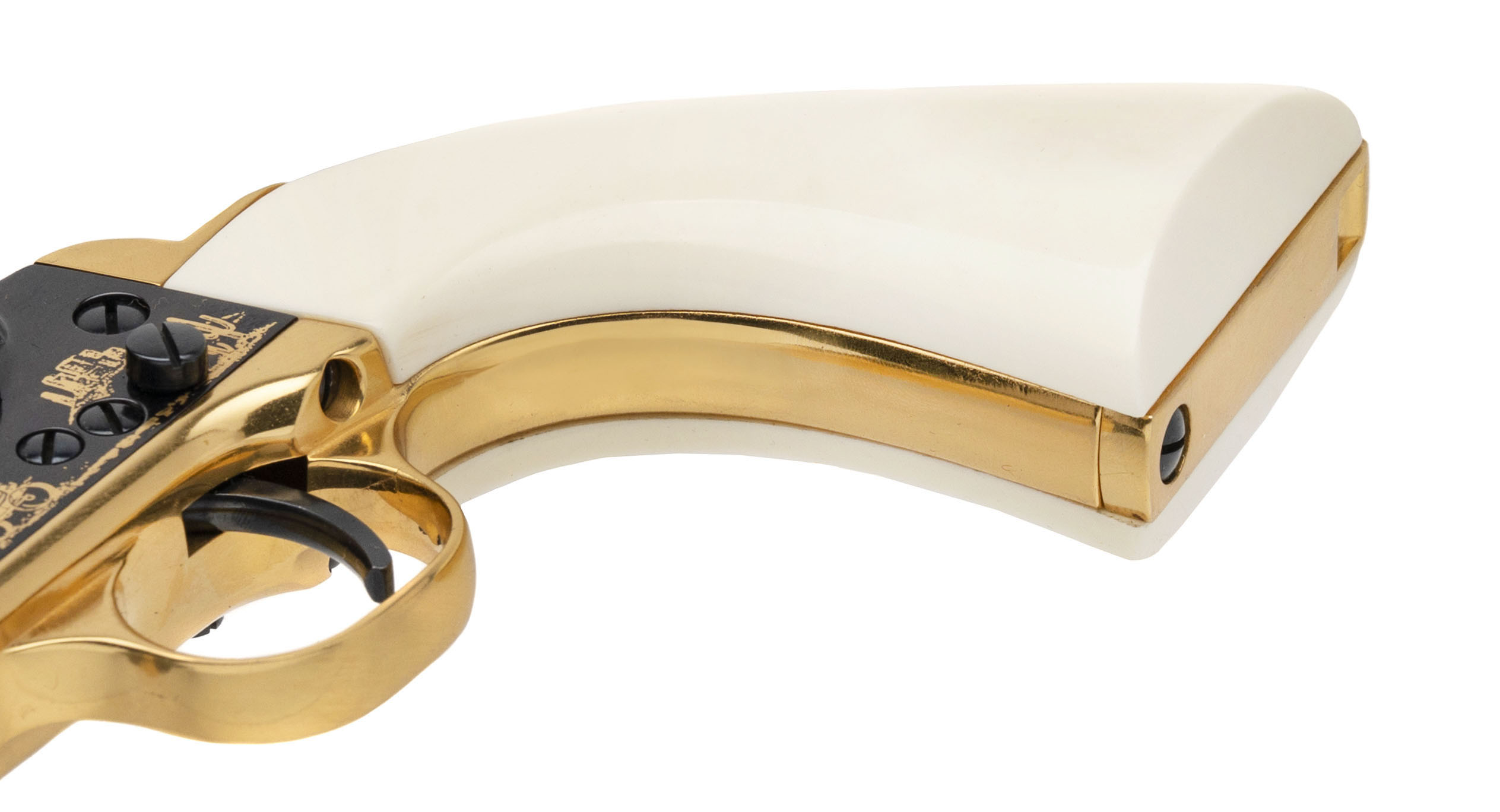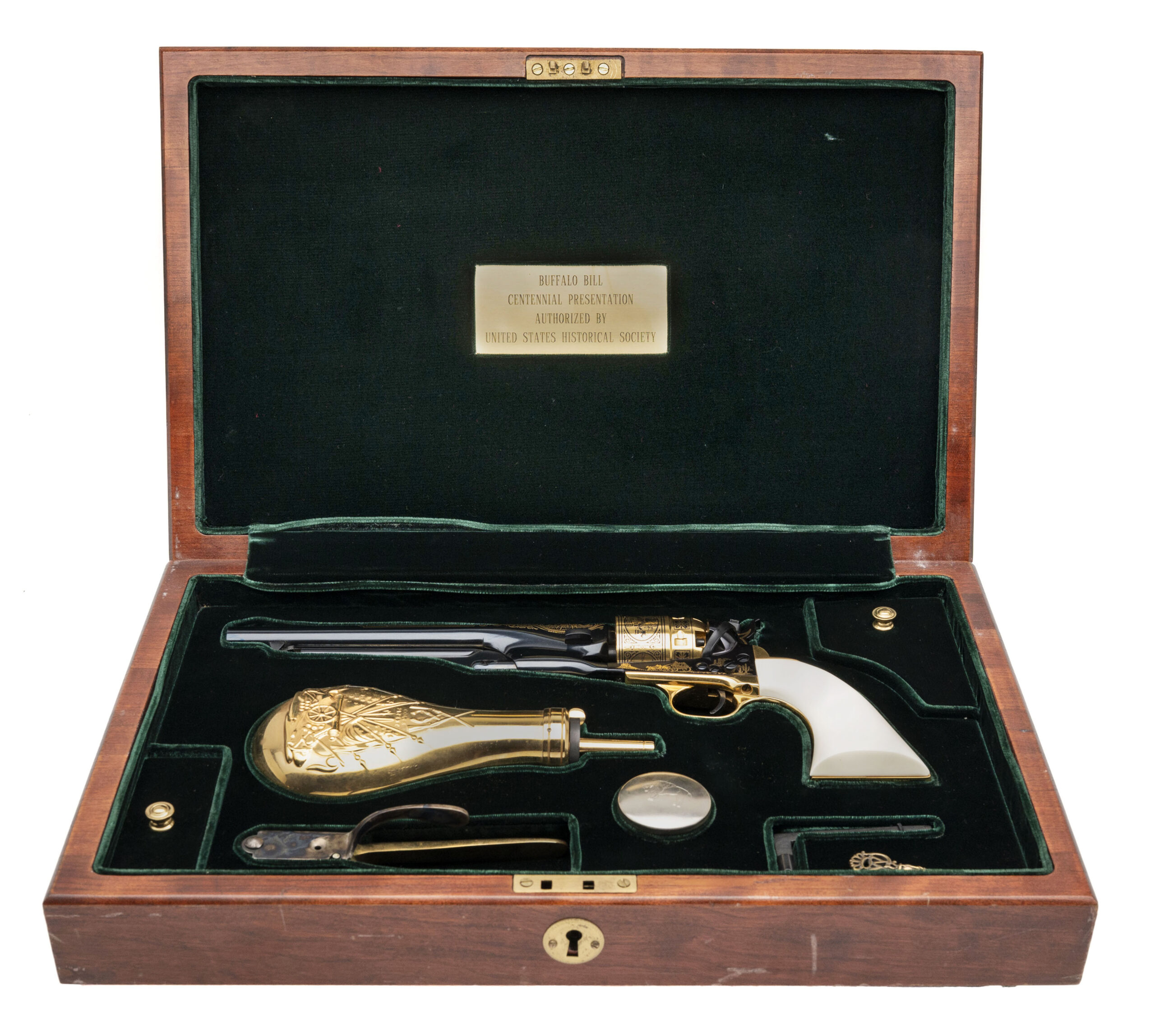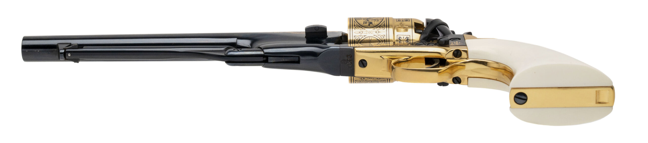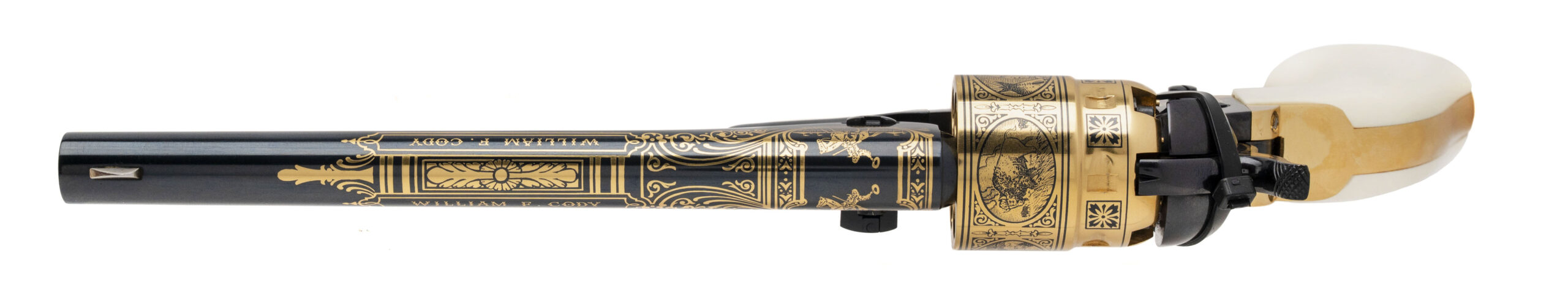 Sn: 1093. 1860 Army percussion revolver with blued finish, gold engraving and gold cylinder & strap with 1 piece faux ivory grips. William F. Cody aka Buffalo Bill commemorative by U.S. Historical Society in excellent condition. Comes with presentation case.