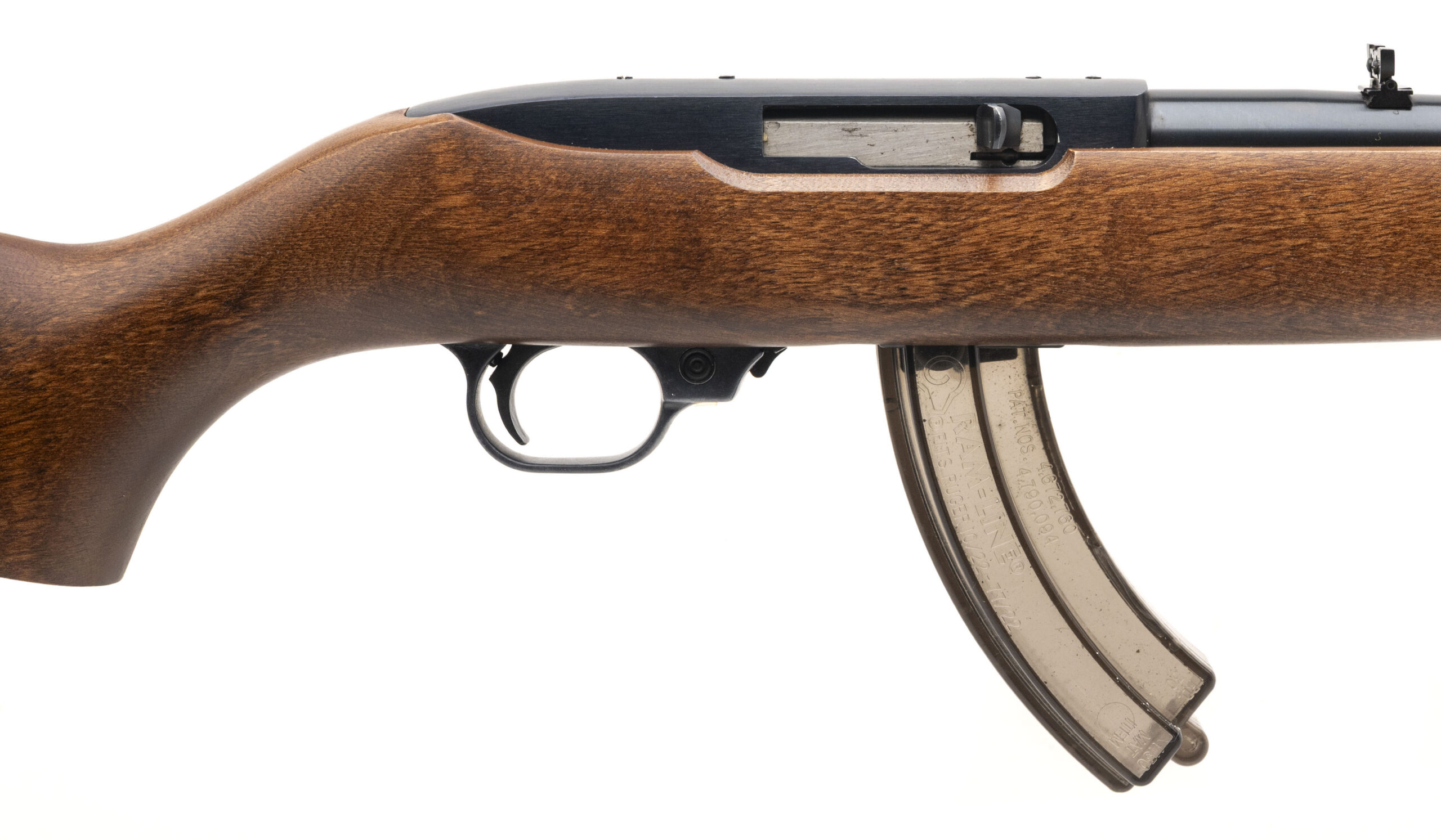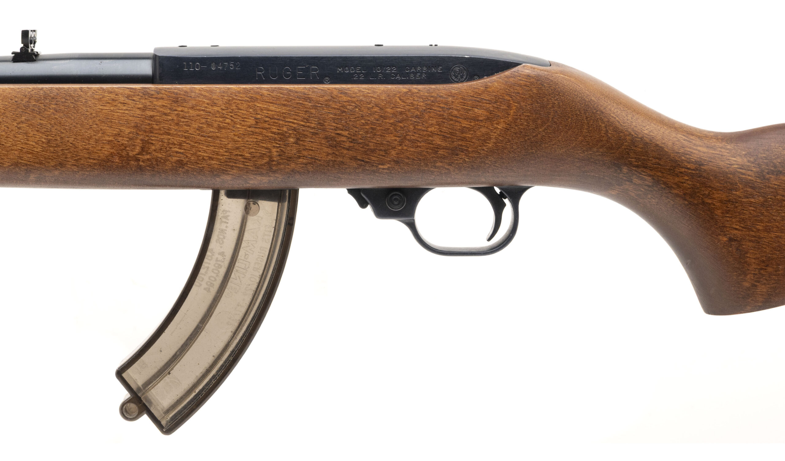 Serial number 110-04752. Made in 1969 with an 18.75-inch barrel that has a bright bore with strong visible rifling. This 10/22 is in exceptionally good condition for its age with original factory blued finish on the barrel & original matte black paint on the receiver. There is a small patch of oxidation on the right side of the front sight band, but otherwise the finish on the rifle's metallic parts is perfect. The trigger group is aluminum. The American Walnut hardwood stock is likewise in excellent condition with hardly any noticeable signs of handling wear. Comes with a used RAM-LINE plastic 30-round magazine.