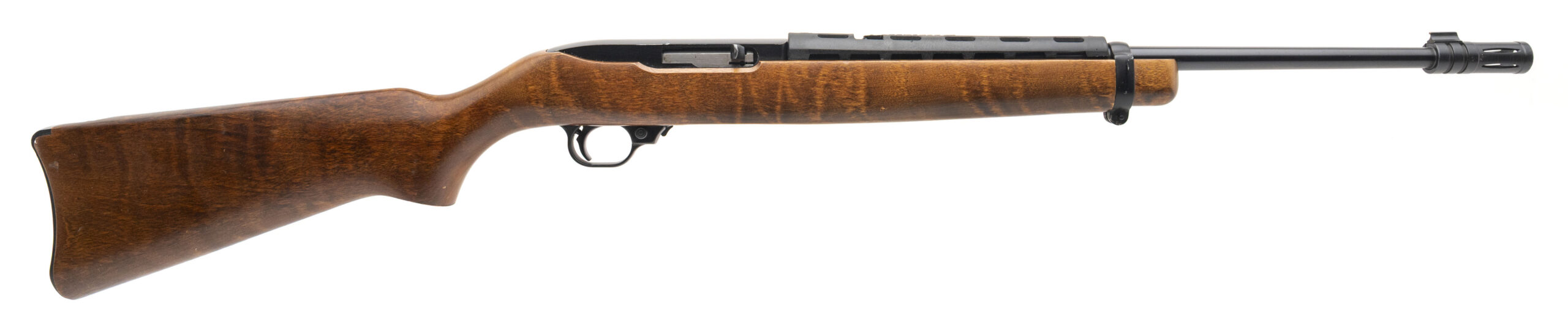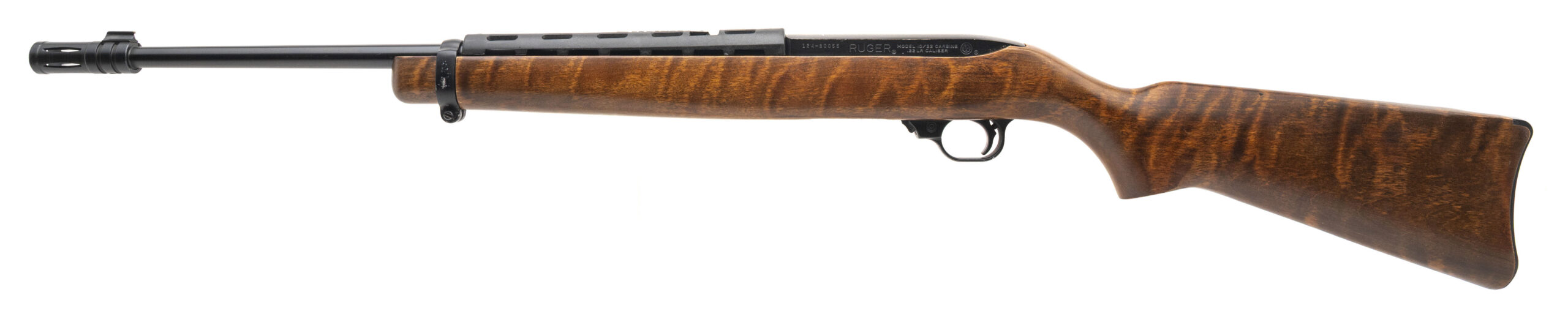 Serial number 124-80055. Made in 1983 with an 18.5-inch barrel that has a bright bore with strong visible rifling. Although this is a standard model 10/22 that is mostly in factory original condition, it is nevertheless equipped with an aftermarket birdcage type muzzle brake/flash hider & a RAM-LINE synthetic handguard. The condition of the gun's metallic parts overall is very good but what makes the gun particularly appealing is the handsome tiger striped birch stock that is in excellent condition. Comes with an original Ruger 10-round rotary magazine.