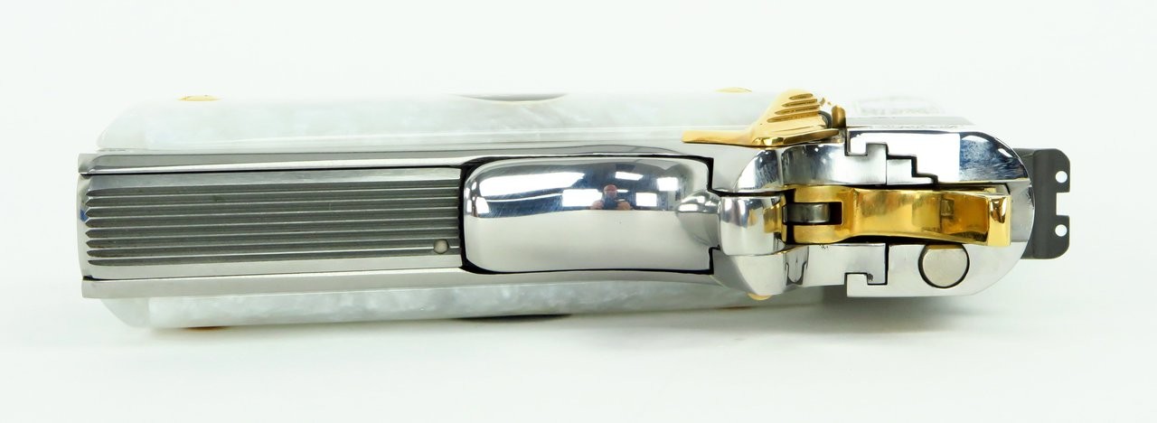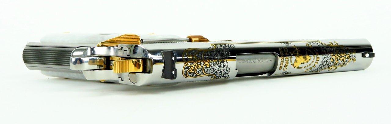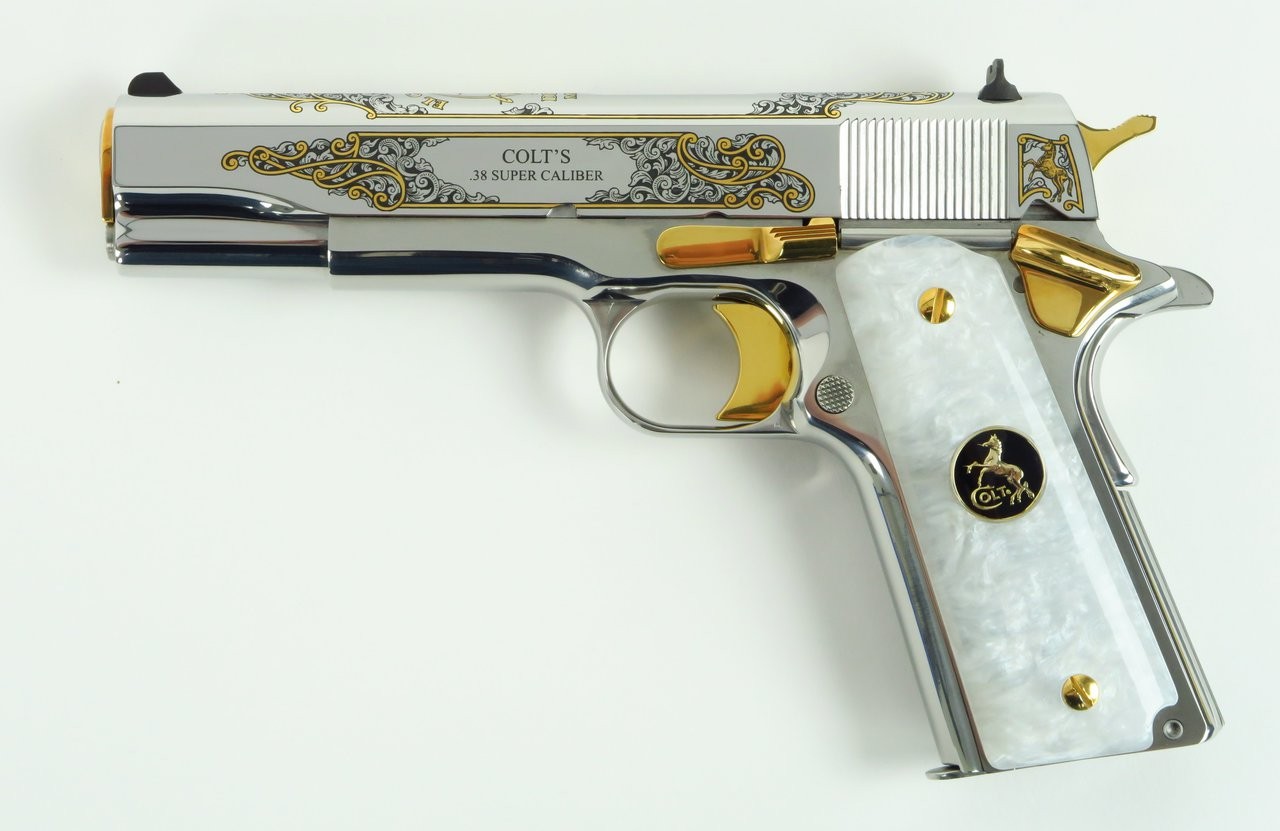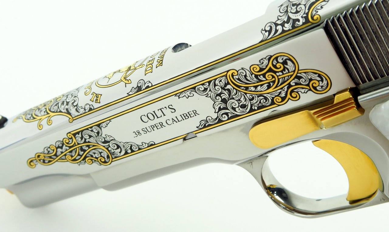 Modern production .38 super with a 5 " Barrel. Bore is in excellent condition. Limited edition 1 of 500 "Bandera de Mexico" decorated with a Mexican motif and engraved slide. Overall excellent condition. Comes with Colt hard case.ban