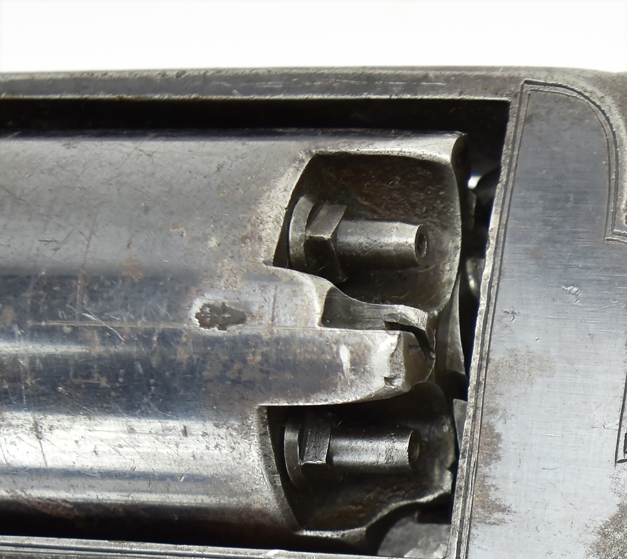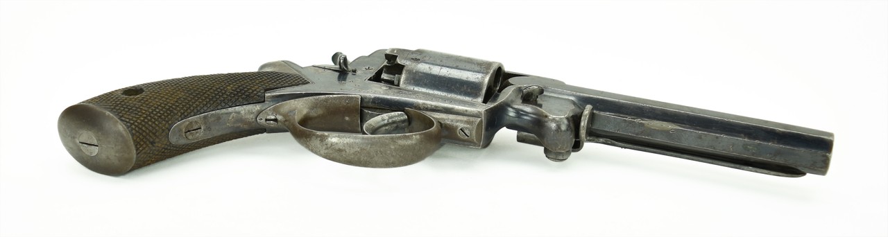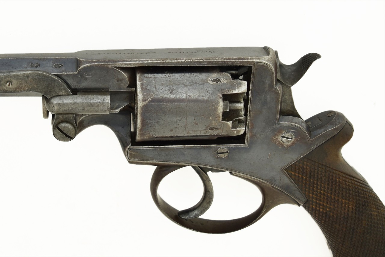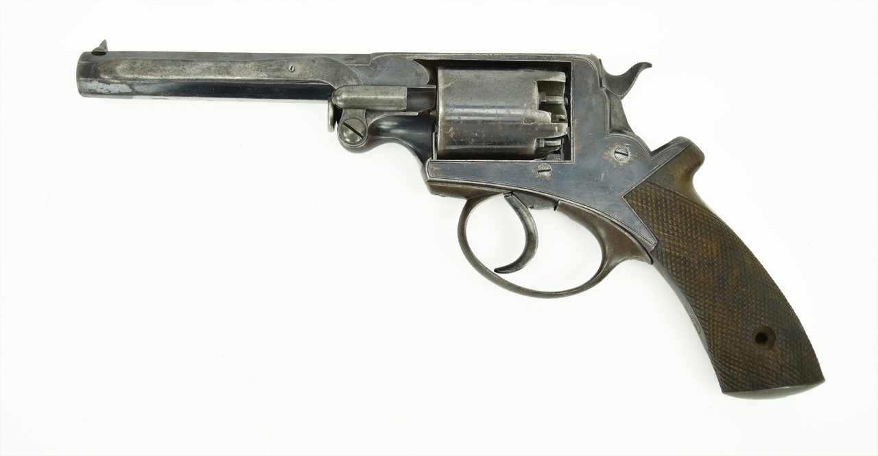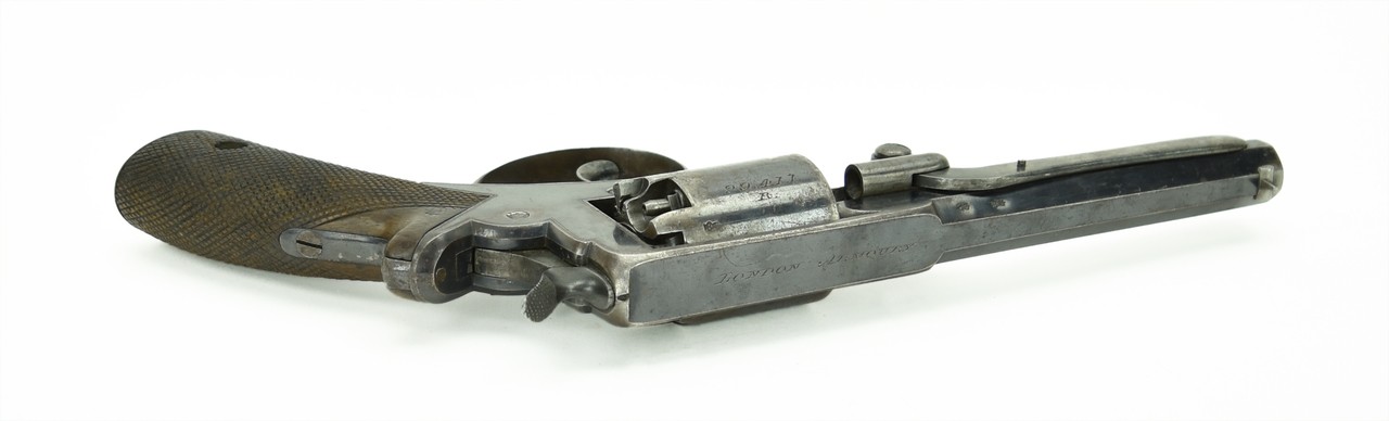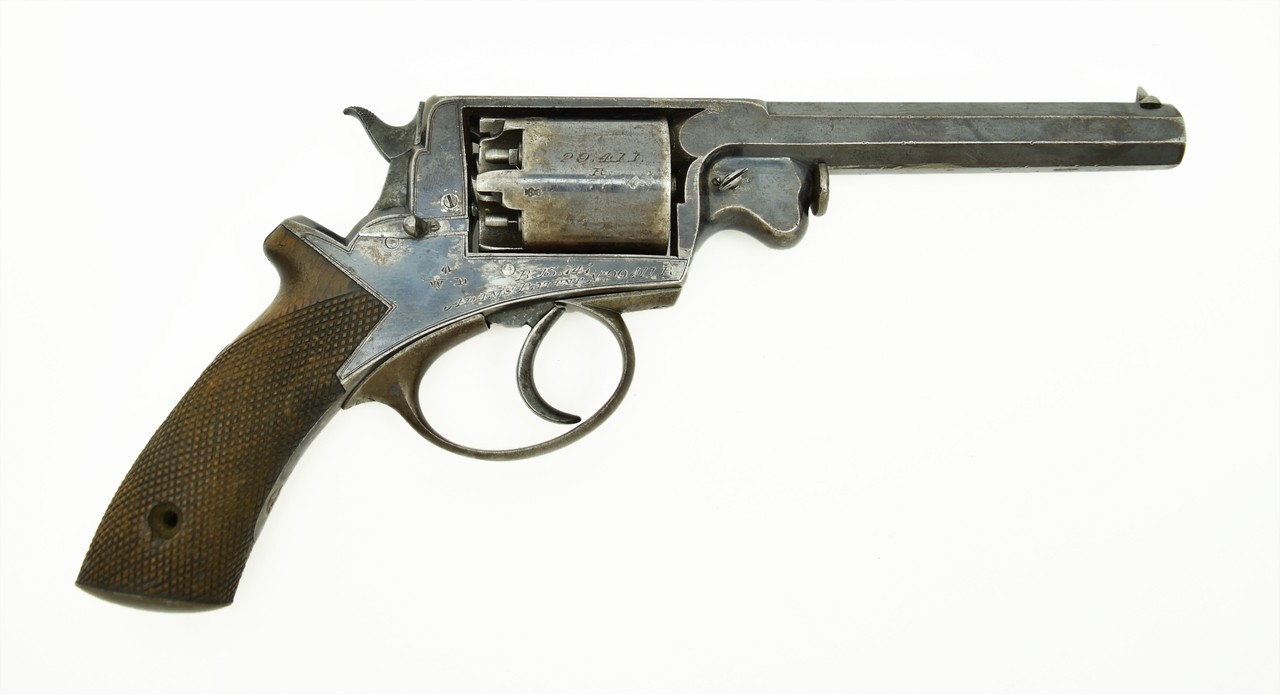 Adams Percussion revolver Mark I. Barrel: 5.5” long. Frame marked W broad arrow D B13 747 R (same on the cylinder) ADAMS PATENT No. 29421. Top strap LONDON ARMOURY. Grip. Marked with a crown over 8.