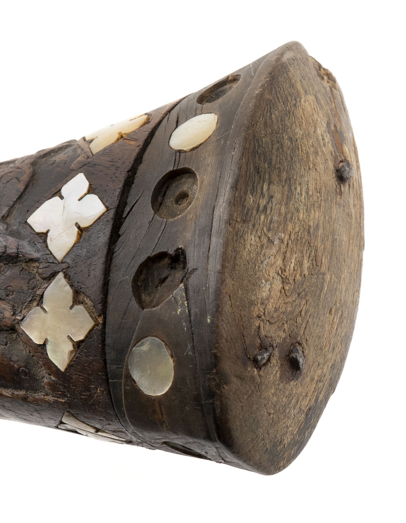 No Serial Number, circa early 19th century, chambered in 1" bore with a 44” octagonal Damascus barrel featuring a cannon-style muzzle. Barrel has a grey patina and is engraved with floral decorations at the breech and muzzle. Secured with four brass wire barrel bands. Lock plate is marked with a rampant lion and dated 1811. Stock is decoratively carved with raised wood near the butt and inlaid with mother of pearl, though some inlay is missing on the butt-cap and butt. Stock shows a light crack near the muzzle and is chipped and worn along the edges. Action holds at both half and full cock.