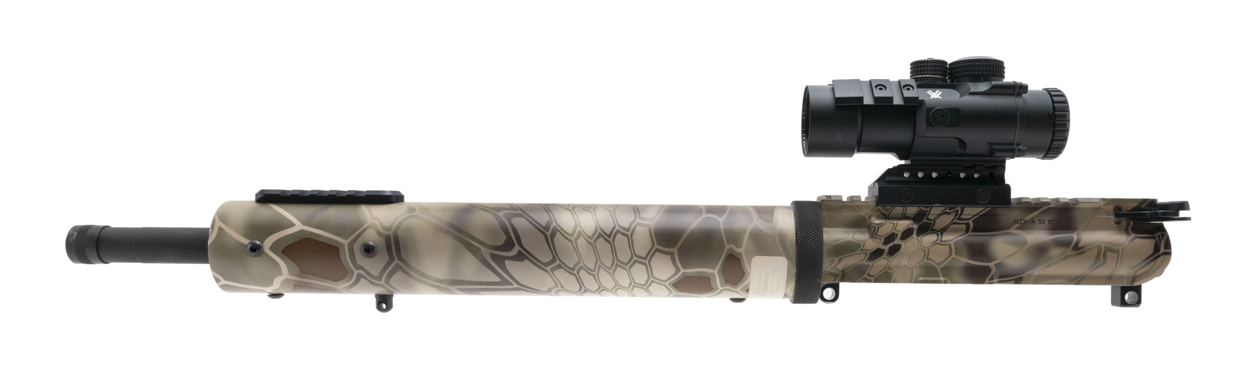 SN: GRENDEL-4146. Modern production. AR-15 pattern rifle made by Alexander Arms. 16" straight-fluted barrel chambered for 6.5 Grendel, with additional matching bull barrel .50 Beowulf upper. Great overall condition with a few handling marks in the snakeskin camo cerakote, mainly around the magazine well. Second upper is complete and comes with mounted Vortex Spitfire 3x scope. Both uppers feature round handguard with front sight rail and additional 3- 6- and 9 o'clock hardpoints for rails. 6.5 Grendel BCG is drilled for right-side charging and comes with extended stainless handle. Lower features Alexander Arms Tactical Single Stage trigger with 3-5# break.