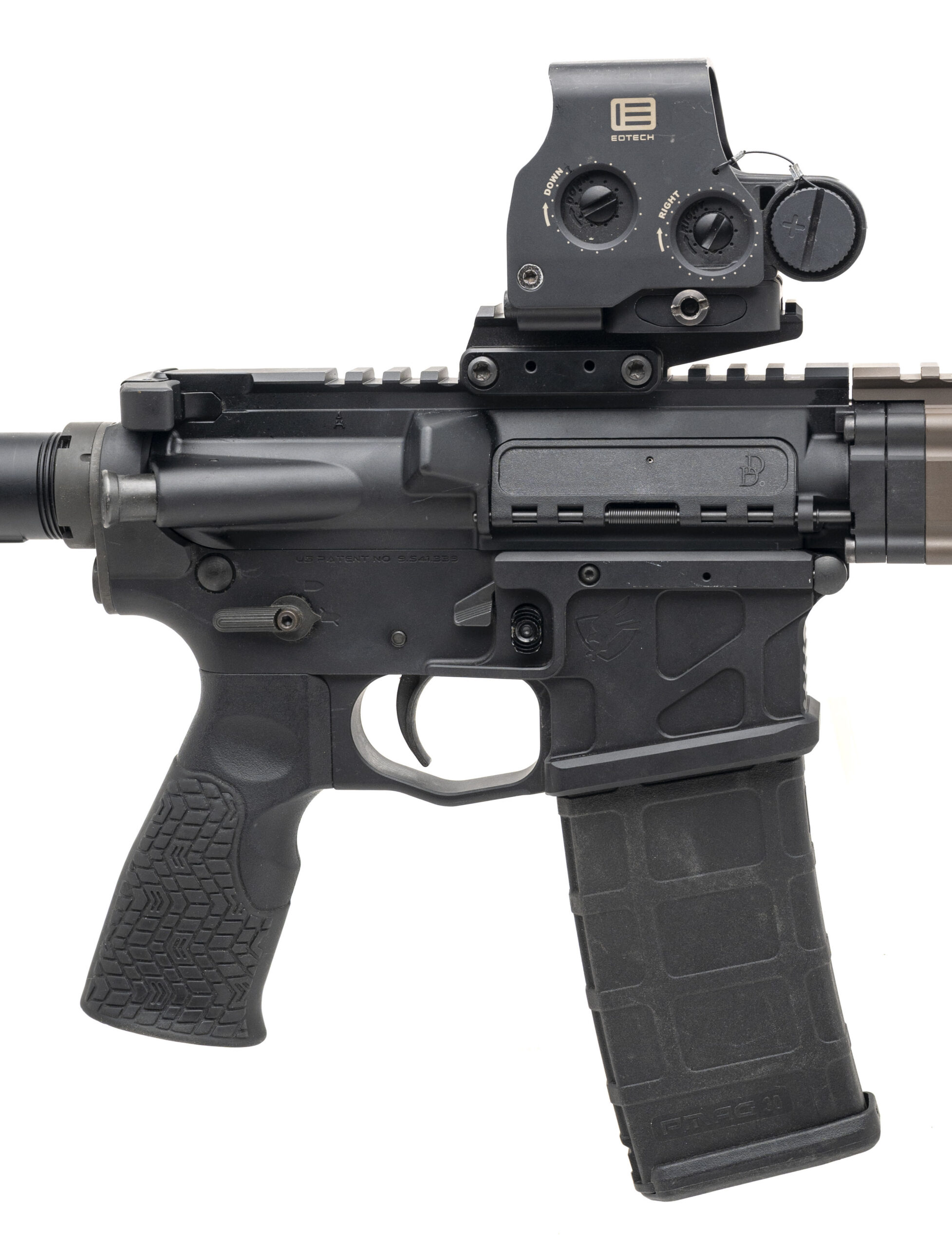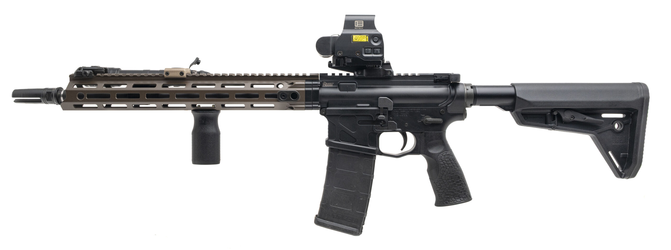 SN: U15-4633. Modern production, 5.56mm with a 16" barrel w/ SF 3-prong flash hider. Bore is very good. Semi-auto tactical rifle with a complete Daniel Defense M4A1 RisIII SOCOM upper receiver group, Eotech XPS 3-1 holographic weapon sight w/red circle dot & night vision on a Unity riser, Magpul MVG vertical grip & MBUS Pro flip-up front sight, Surefire Scout3 flashlight w/Unity taper switch, and ambidextrous controls. Near excellent condition overall.