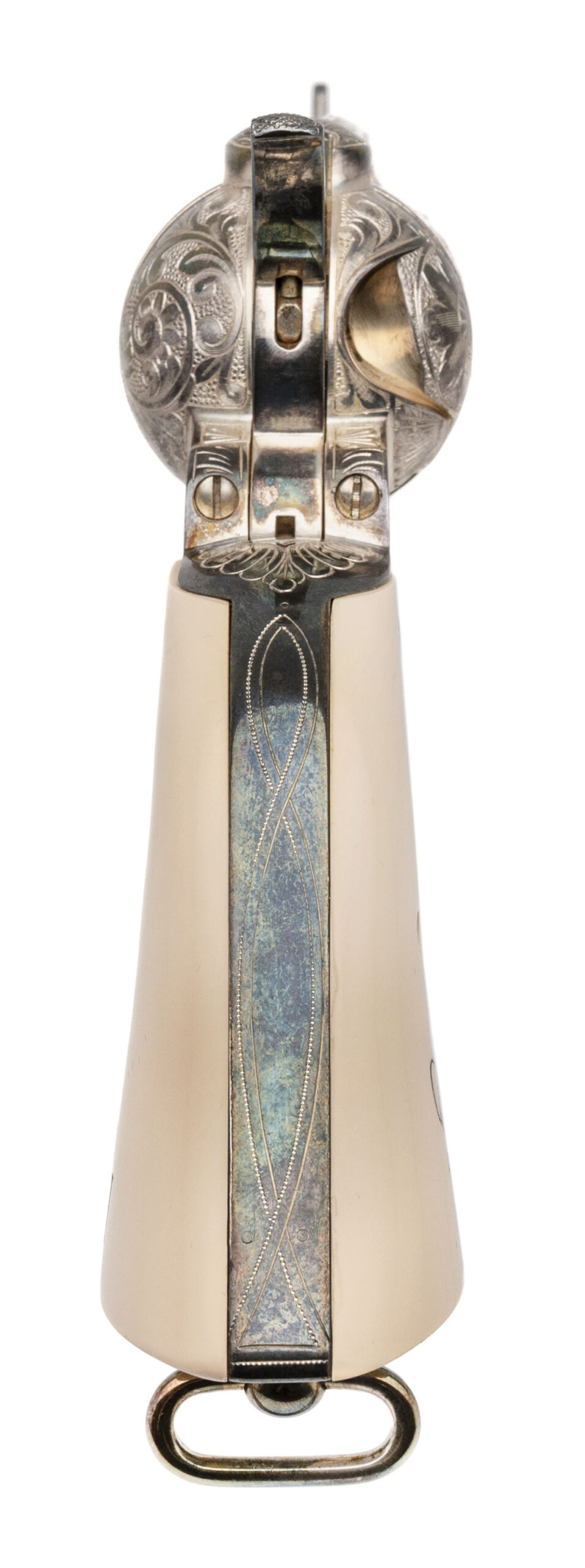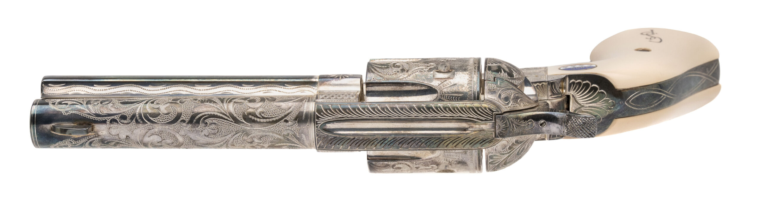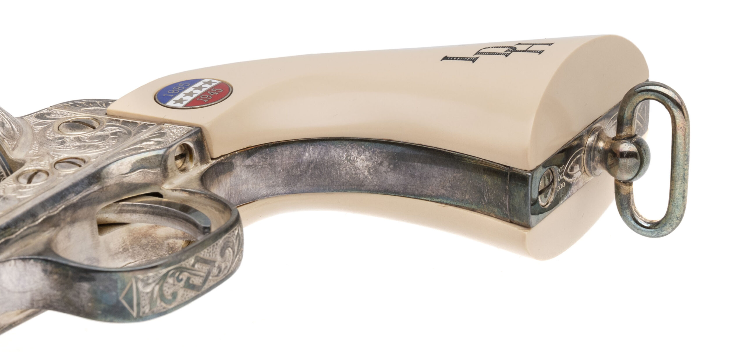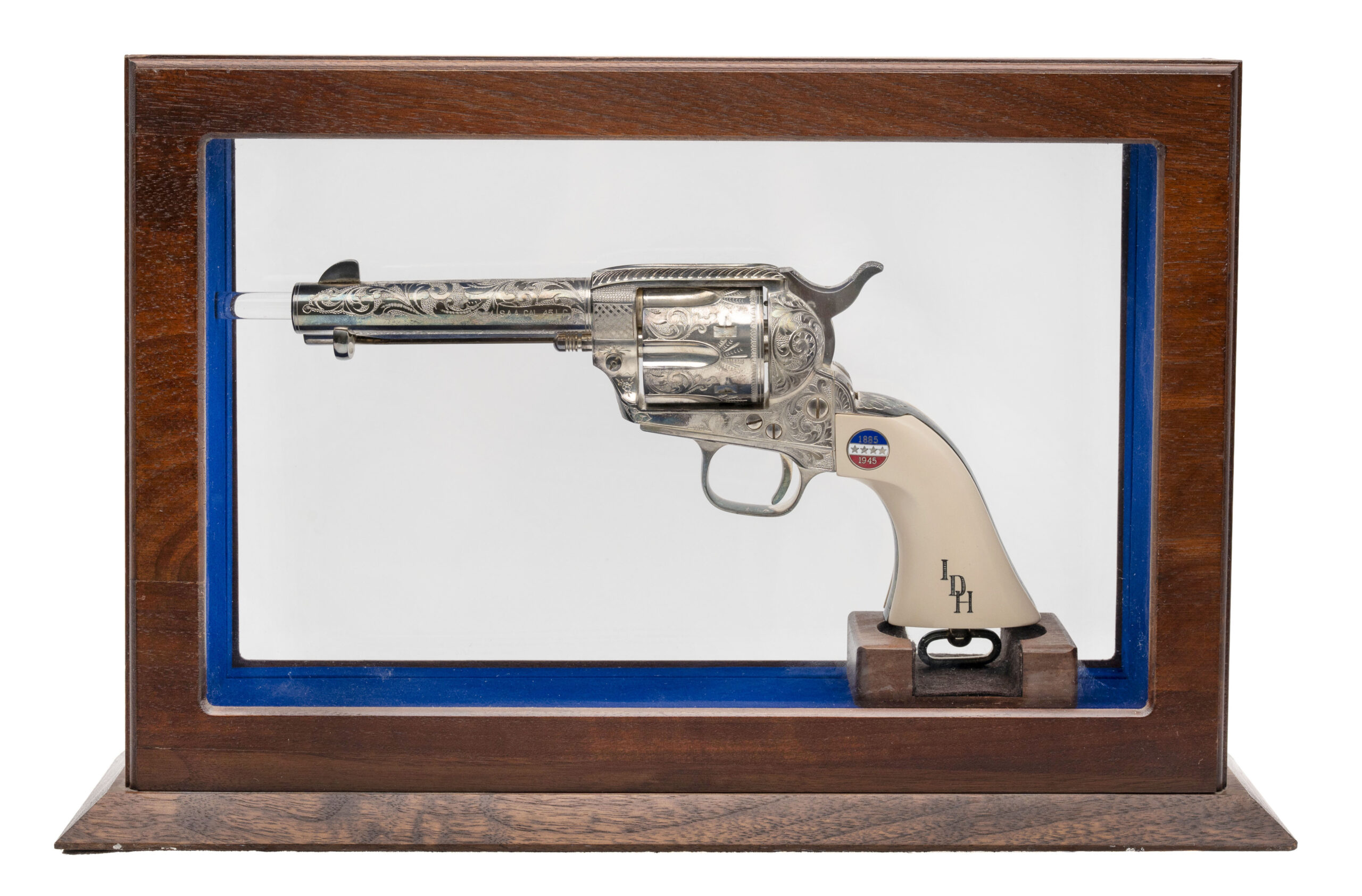 SN: P0600, one of 2500 made in 1987. Highly engraved nickel plated .45 long colt Single Action Army with a 4.75” barrel and white plastic grips with GSP on one side and IDH on the other with a medallion that has 4 stars and 1885 over 1945 his DOB and DOD. Overall in very good condition, comes with a stand up display case with engraved plaque.