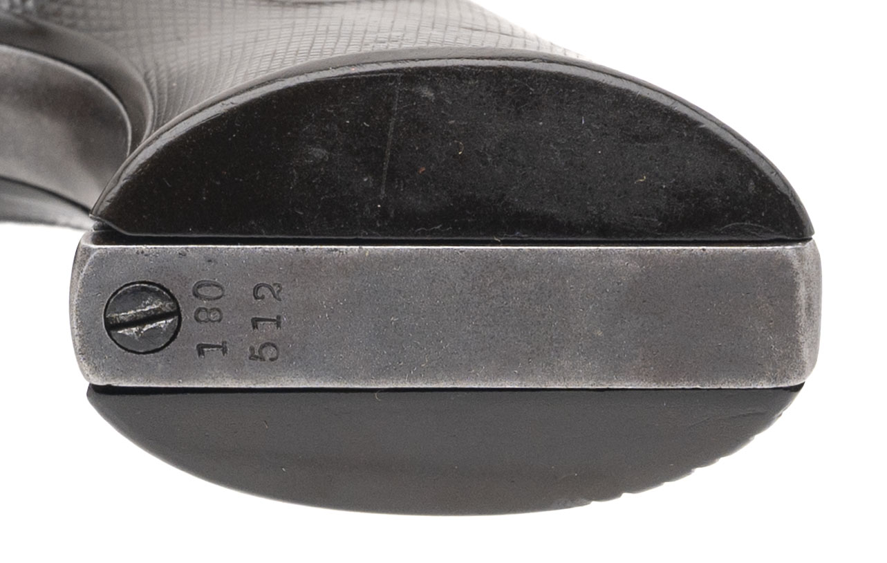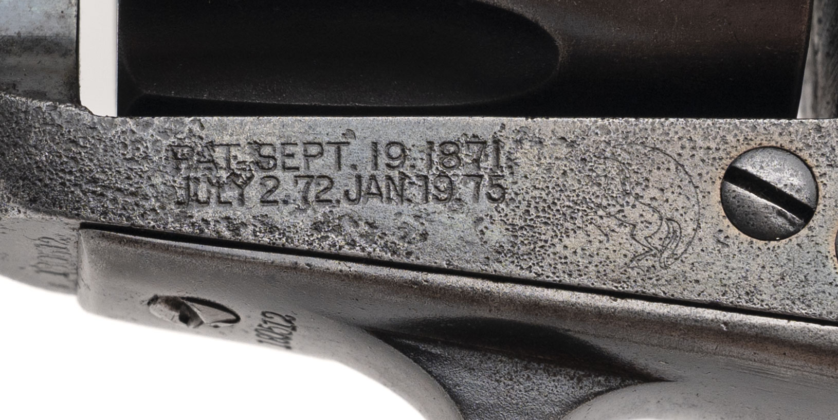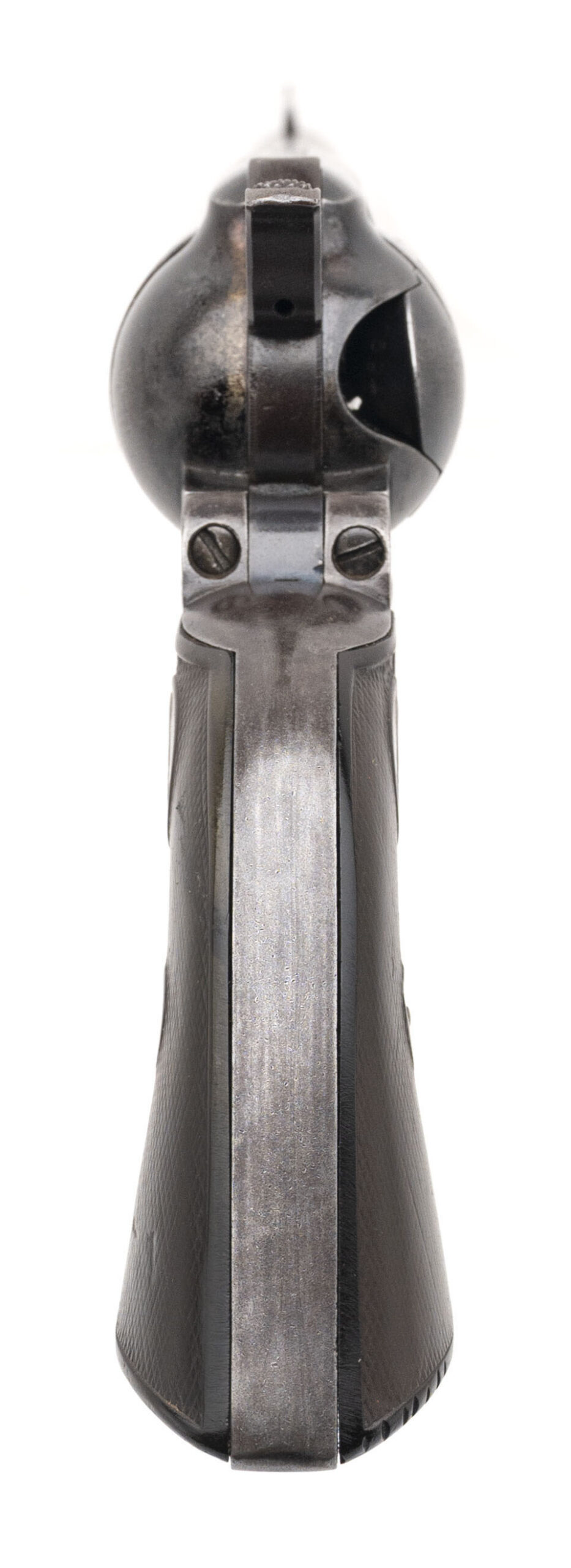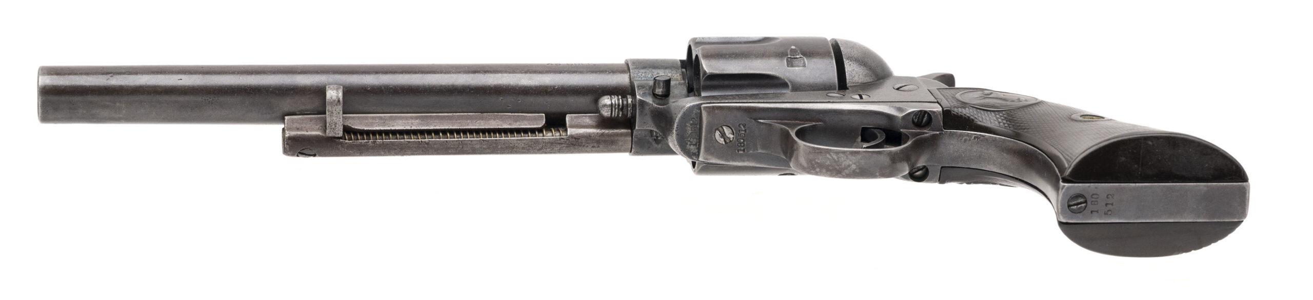 SN:180512. Made in 1898. Chambered for the .45 LC cartridge with a 7.5-inch barrel. This gun has a smooth even dark brown to gray patina. The barrel is a well made replacement that has been aged to match. The frame and cylinder have light pin point pitting. The grips show allot of carry wear. The bore is excellent and the action works well. Accompanying this gun is a factory letter confirming the configuration. It was shipped to J. F. Schmelzer & Sons Arms Company in Kansas City, Kansas on October 27, 1898. DALLAS LOCATION.