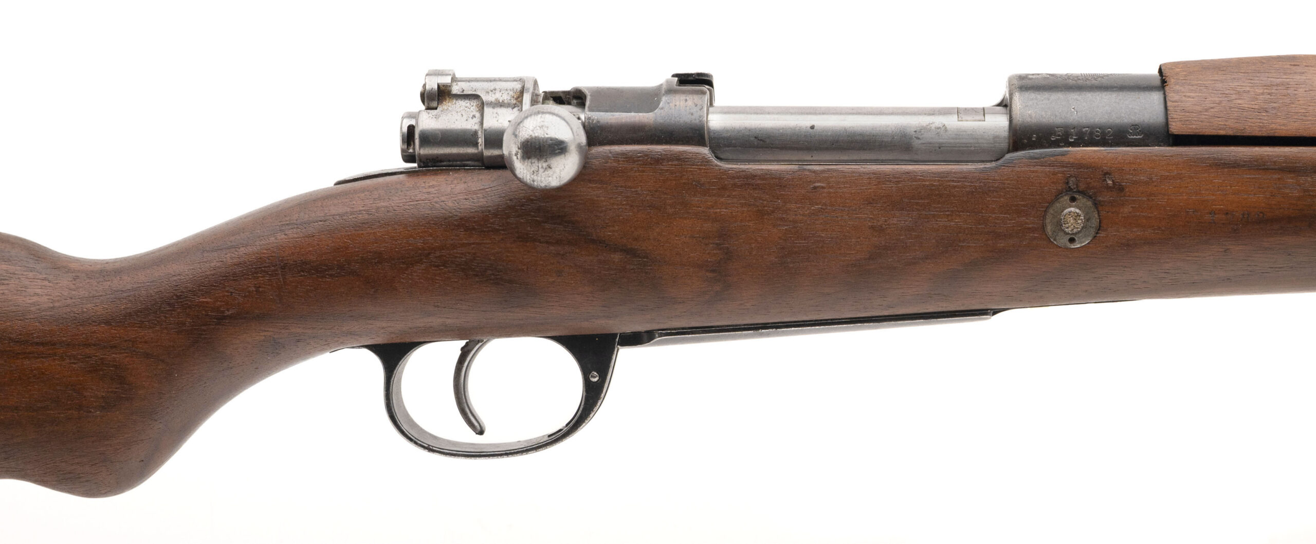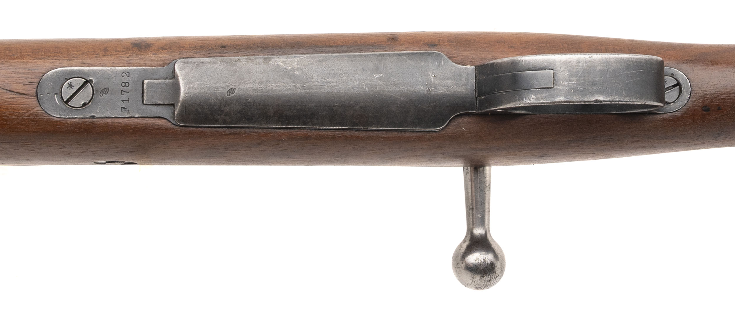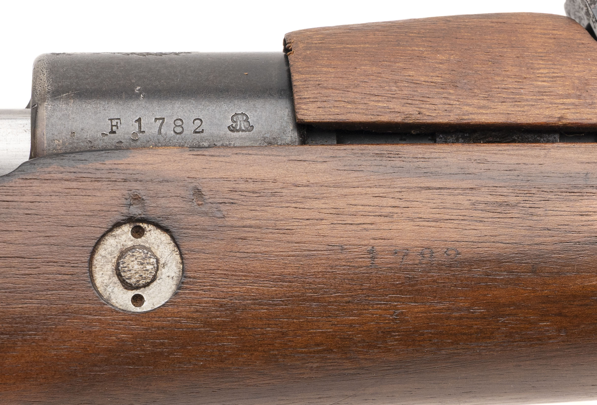 Serial No. F1782, manufactured in 1910, chambered in 7.65×53mm with a 29½" round barrel. The bore is bright with strong, well-defined rifling. Serial numbers are matching throughout; the stock serial number is faint but remains legible. Metal surfaces have thinned to a smooth brown/grey patina, while factory markings on the receiver remain sharp and crisp. The stock is in very good condition, showing only light handling impressions consistent with careful service and storage. Overall presentation is clean and honest. Action is smooth and functions correctly.