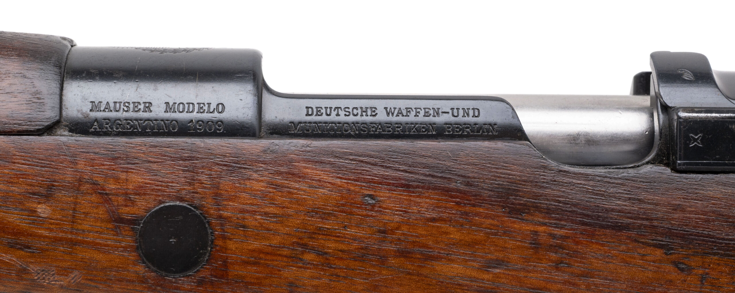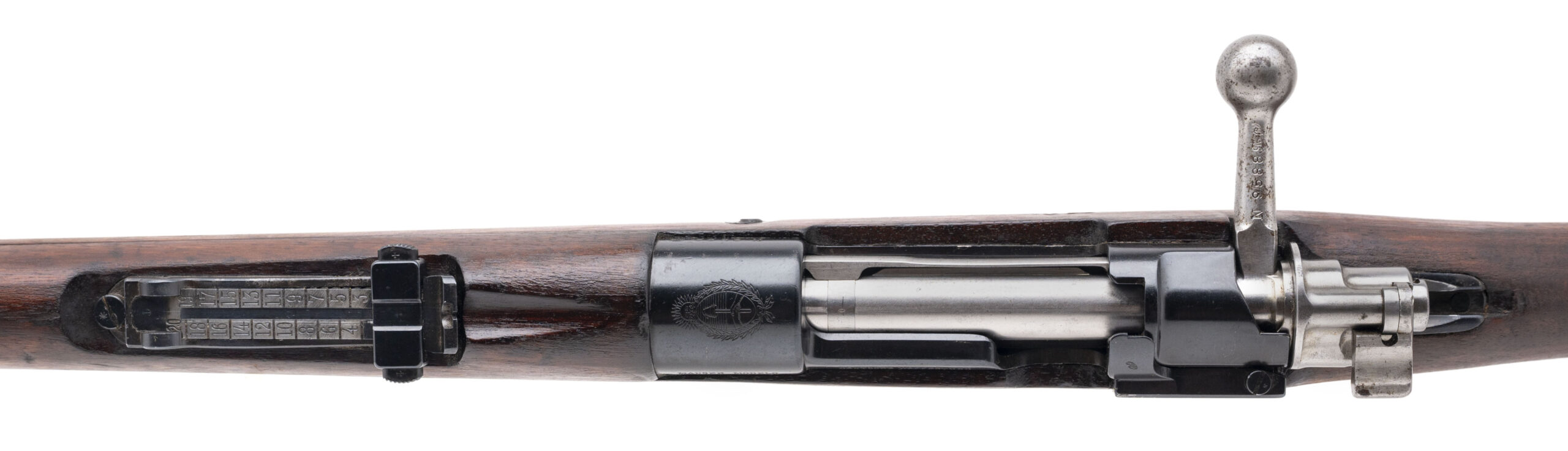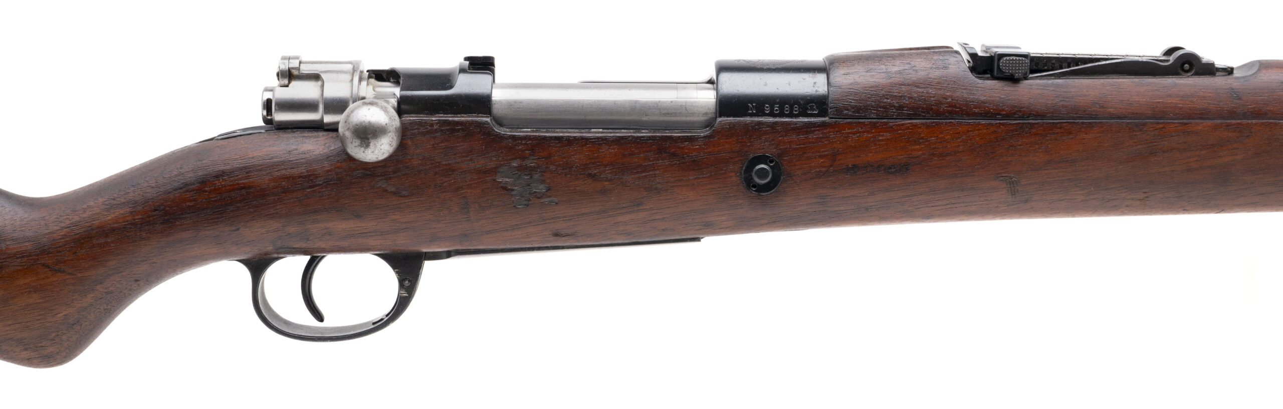 Serial No. N9588, manufactured circa 1912, chambered in 7.65x53mm with a 29½" round barrel. Serial numbers are matching throughout, and the receiver bears a sharp Argentine crest. Factory markings remain clear and well-defined. The stock has been lightly refurbished and shows only minor handling evidence, presenting very well for a Model 1909. Action is smooth and functions correctly. A clean, attractive example of Argentina’s premier Mauser-pattern service rifle.