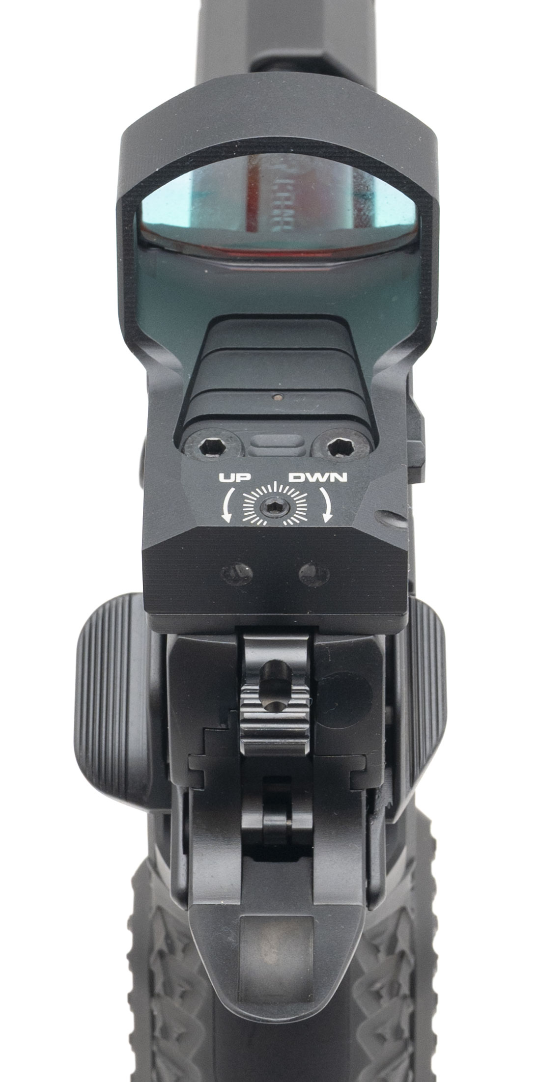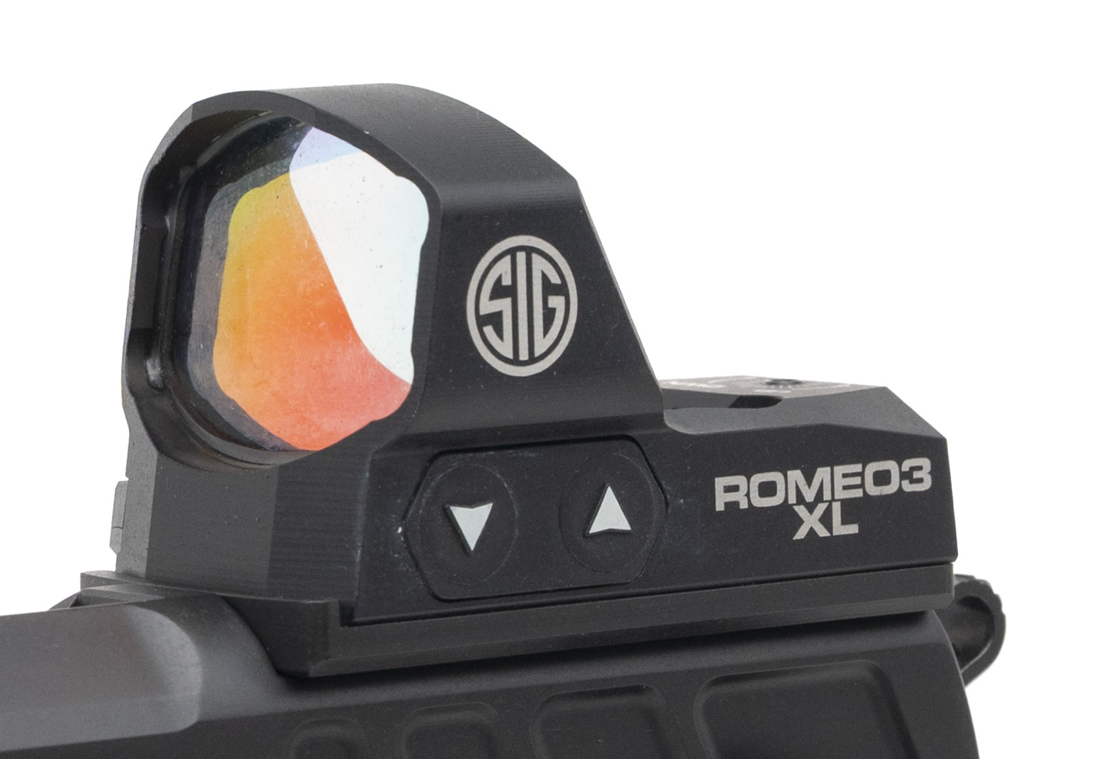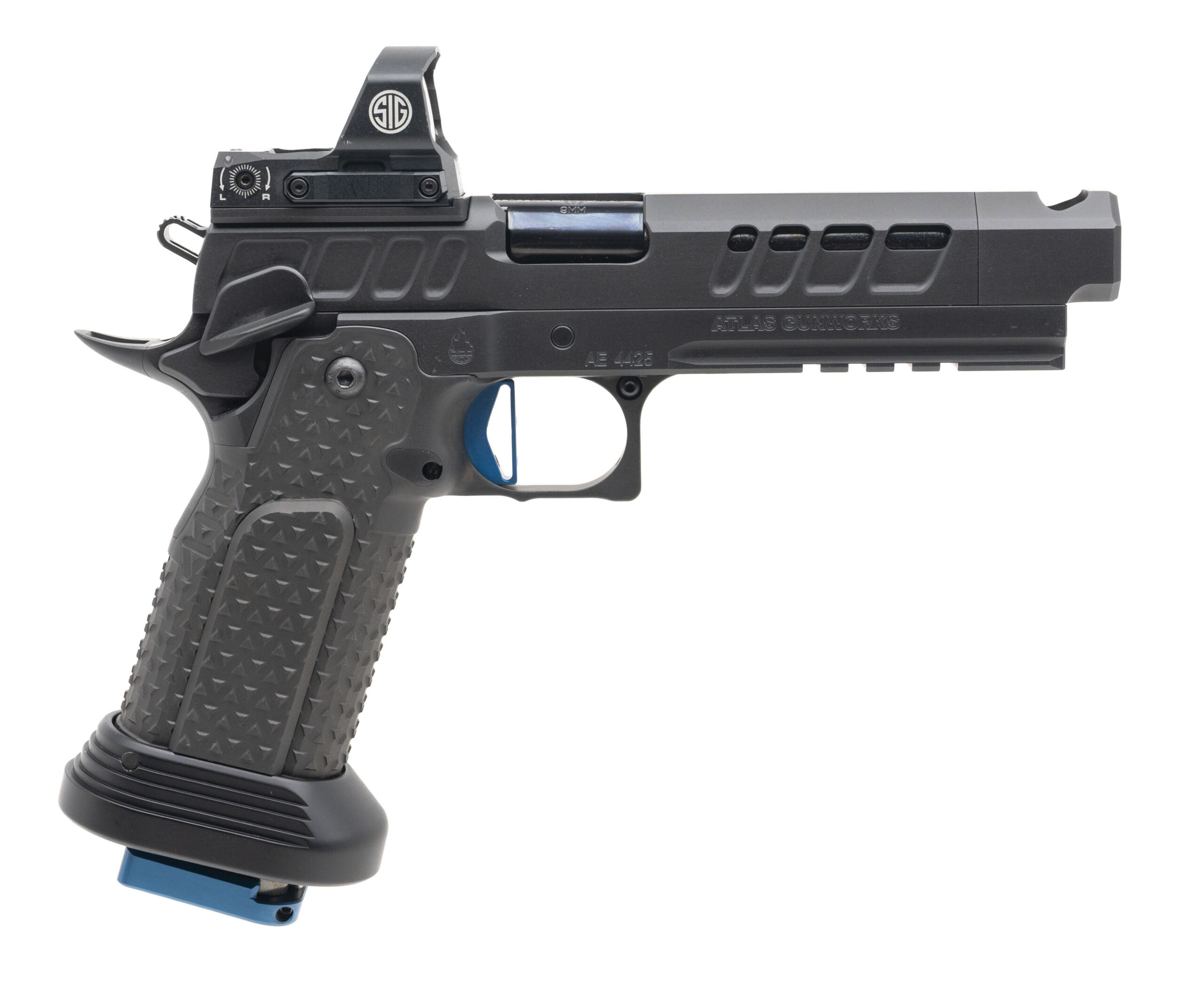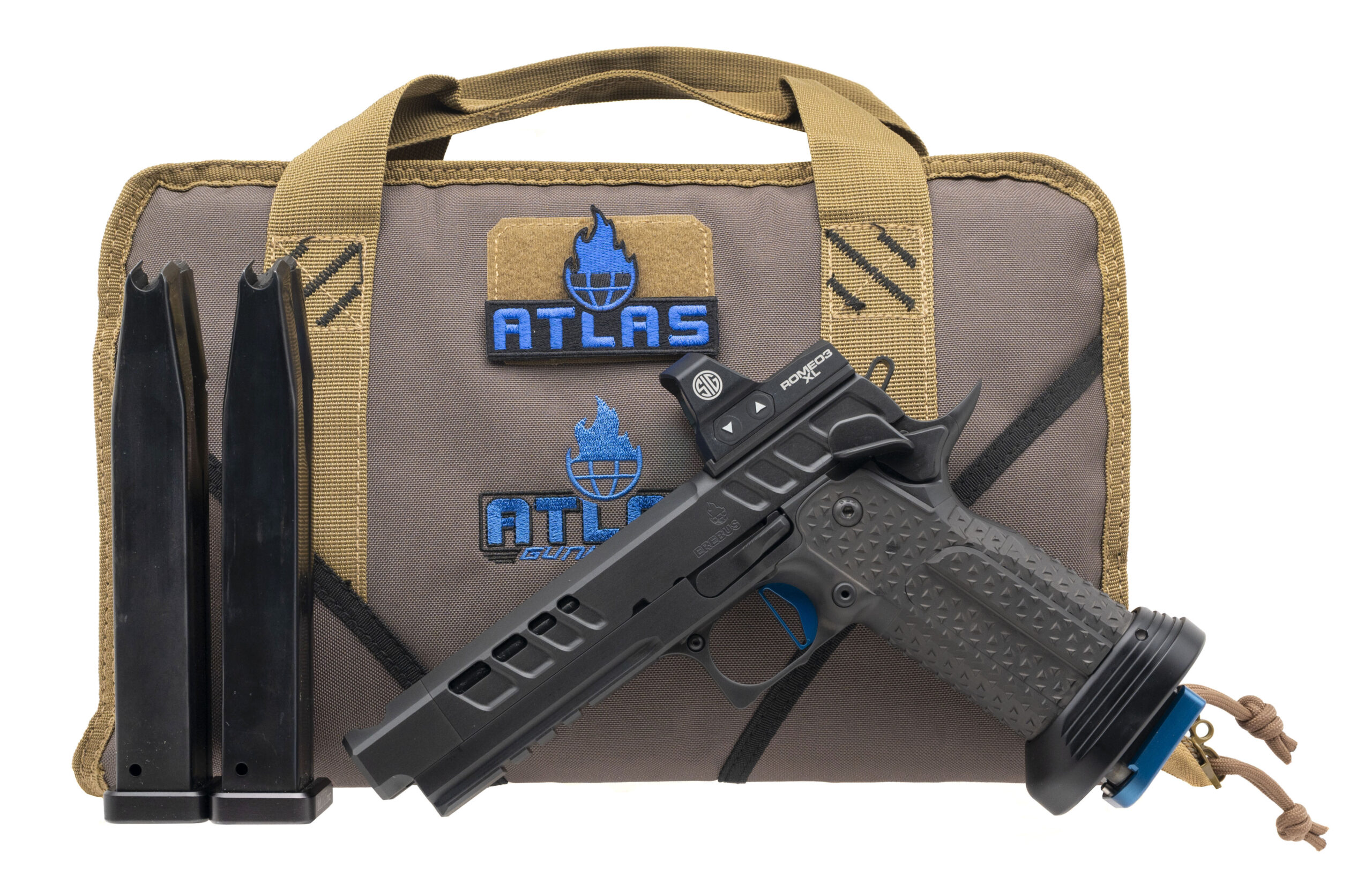 SN: AE4425. Modern production, 9mm with a 4.6" DLC coated barrel w/compensator. Bore is bright with strong visible rifling. Premium 2011 style performance pistol with a Sig Romeo3 XL red dt optic, aluminum grip module w/palm swell & step panels, blue flat-faced trigger w/2LB weight, and a flared magwell. Near excellent condition with Atlas carry bag and two extra magazines.
