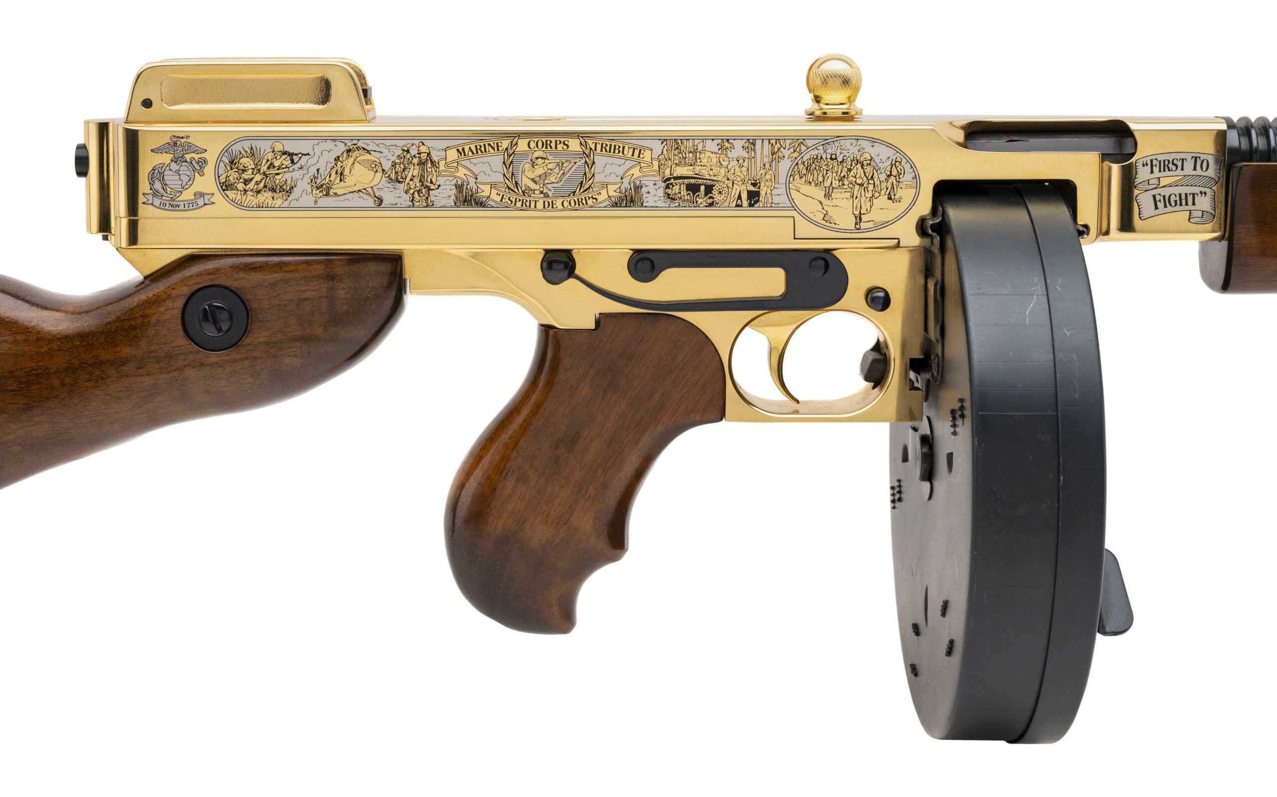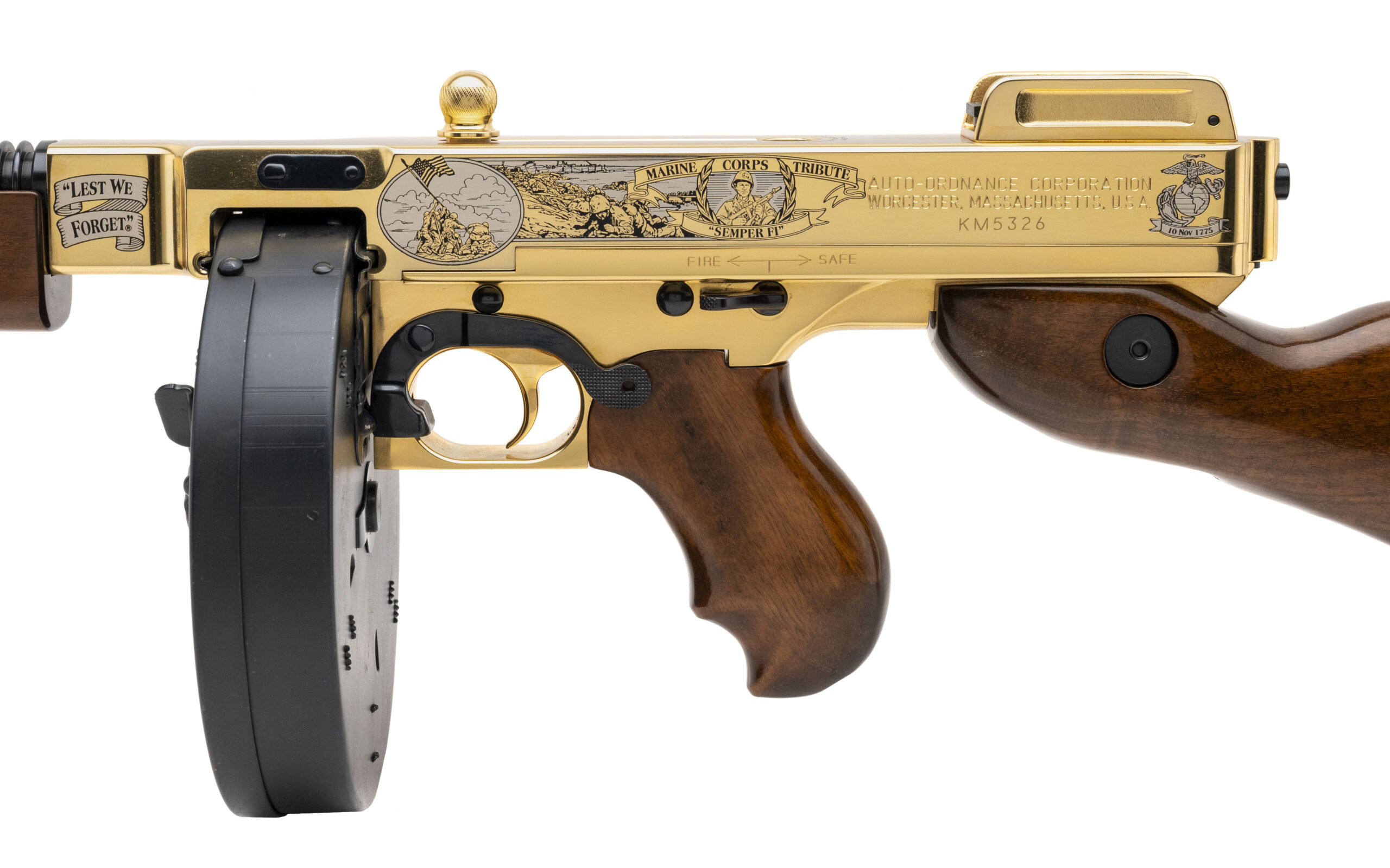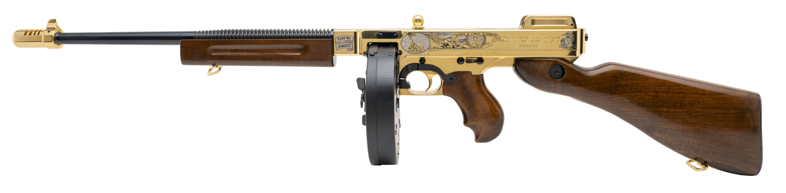 SN: KM5326. Modern production, .45 Acp with a 16" barrel w/ flash hider. Bore is bright with excellent rifling. Armed Forces Commemorative semi-auto tommy gun with engraved receiver. Gold metal and walnut wood stock are in excellent condition with minor nicks and faint scratches. Overall condition is excellent. Comes with straight magazine and drum mag.