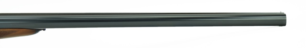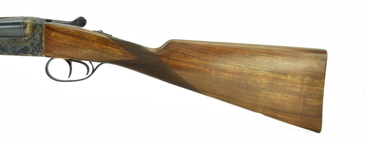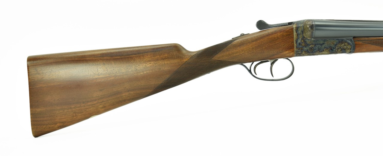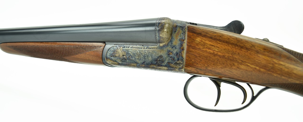 Aya XXV 12 Gauge shotgun. Model XXV deluxe boxlock ejector gun. Has 25” modified/improved cylinder barrels, fully engraved case colored receiver, double triggers and straight stock. Length of pull is 14 5/8”. A light sleek bird gun in excellent condition.