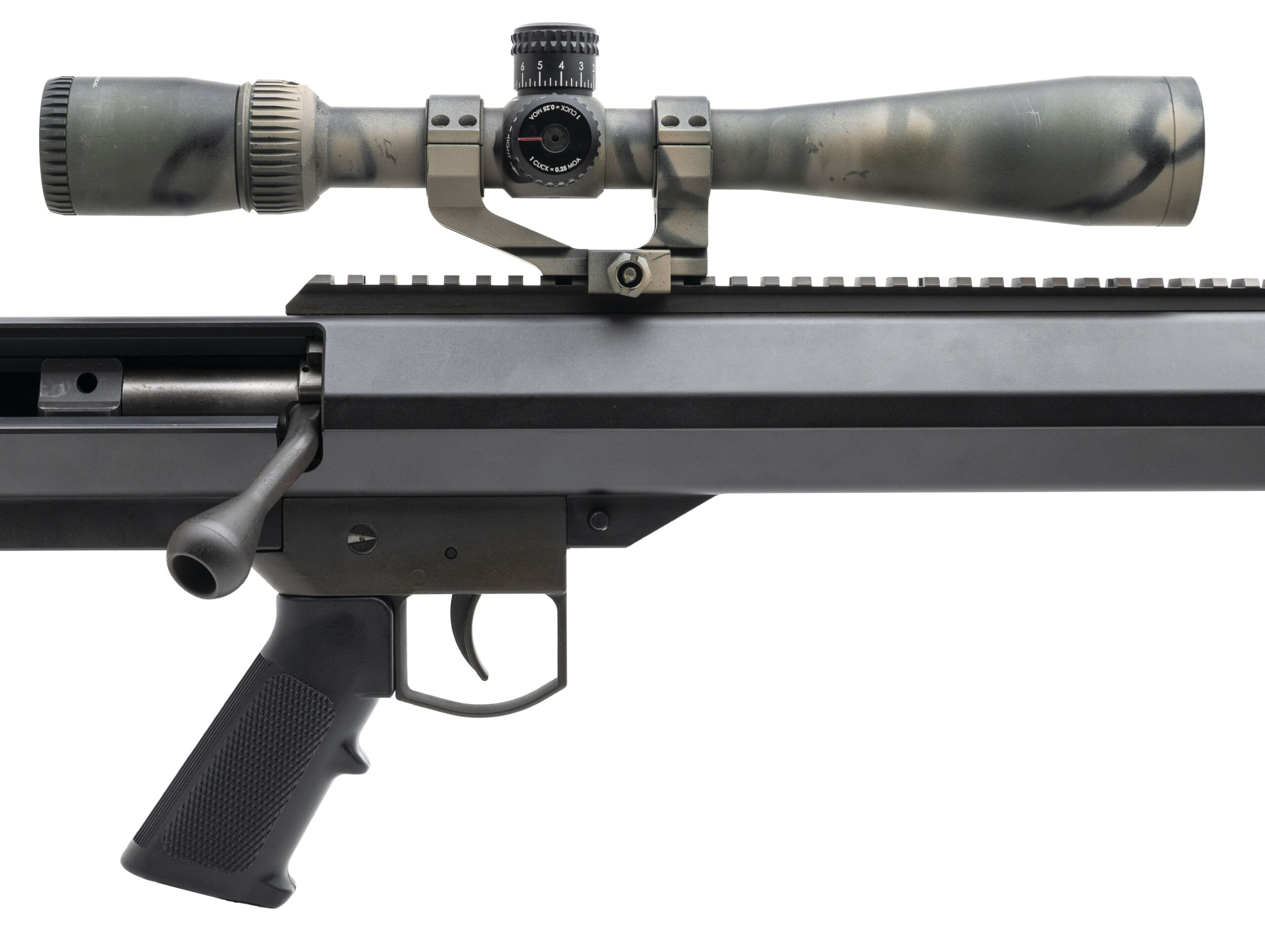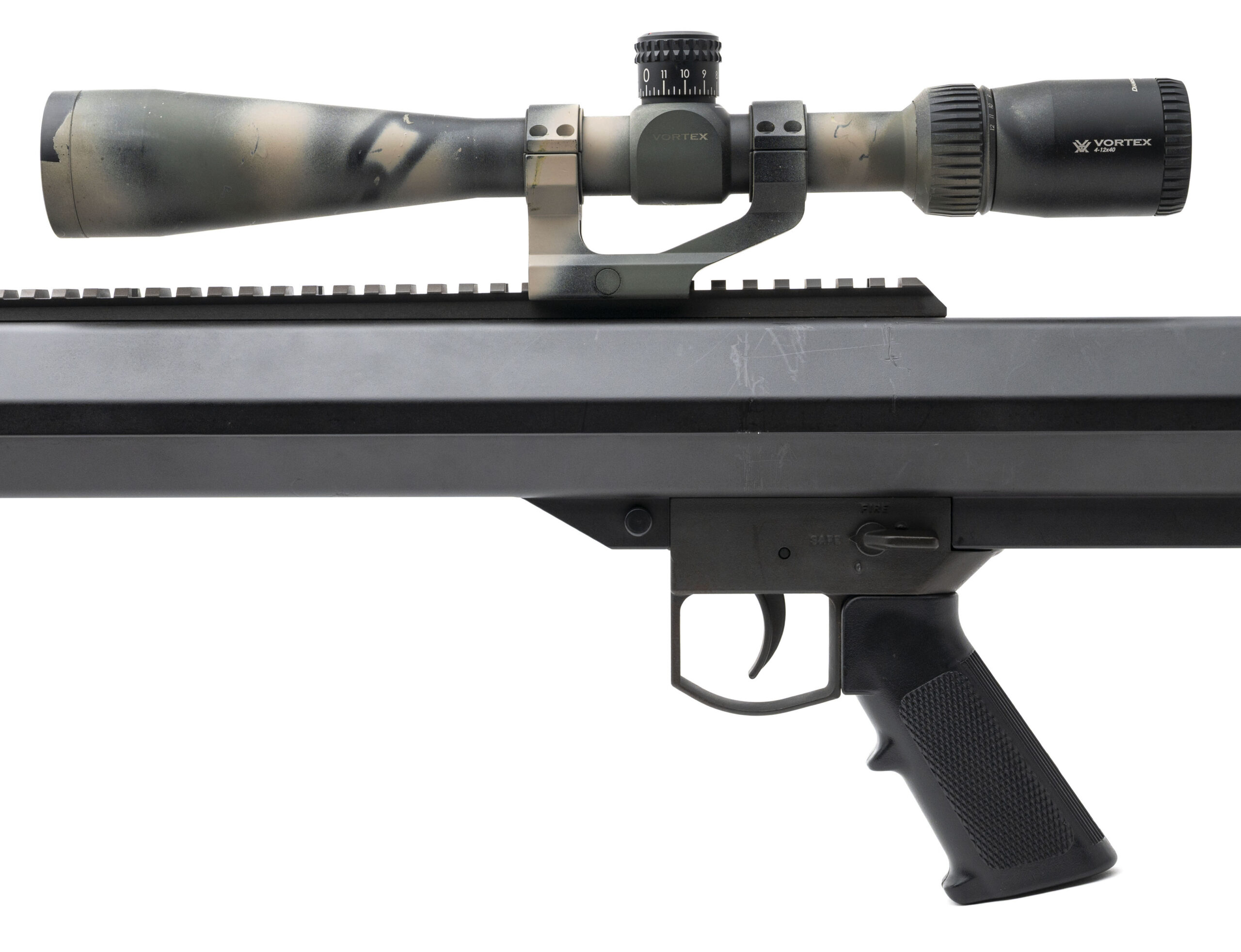 SN: AD002695. Modern production, .416 Barrett with a 32" heavy barrel w/3-chamber muzzle brake. Bore is excellent. Bolt-action precision single-shot rifle with a Vortex Diamondback Tactical 4-12X40 scope, collapsible bi-pod, rear handgrip, and matte black finish. Finish shows minor handling marks throughout. Overall condition is very good. Includes custom fit pelican case.