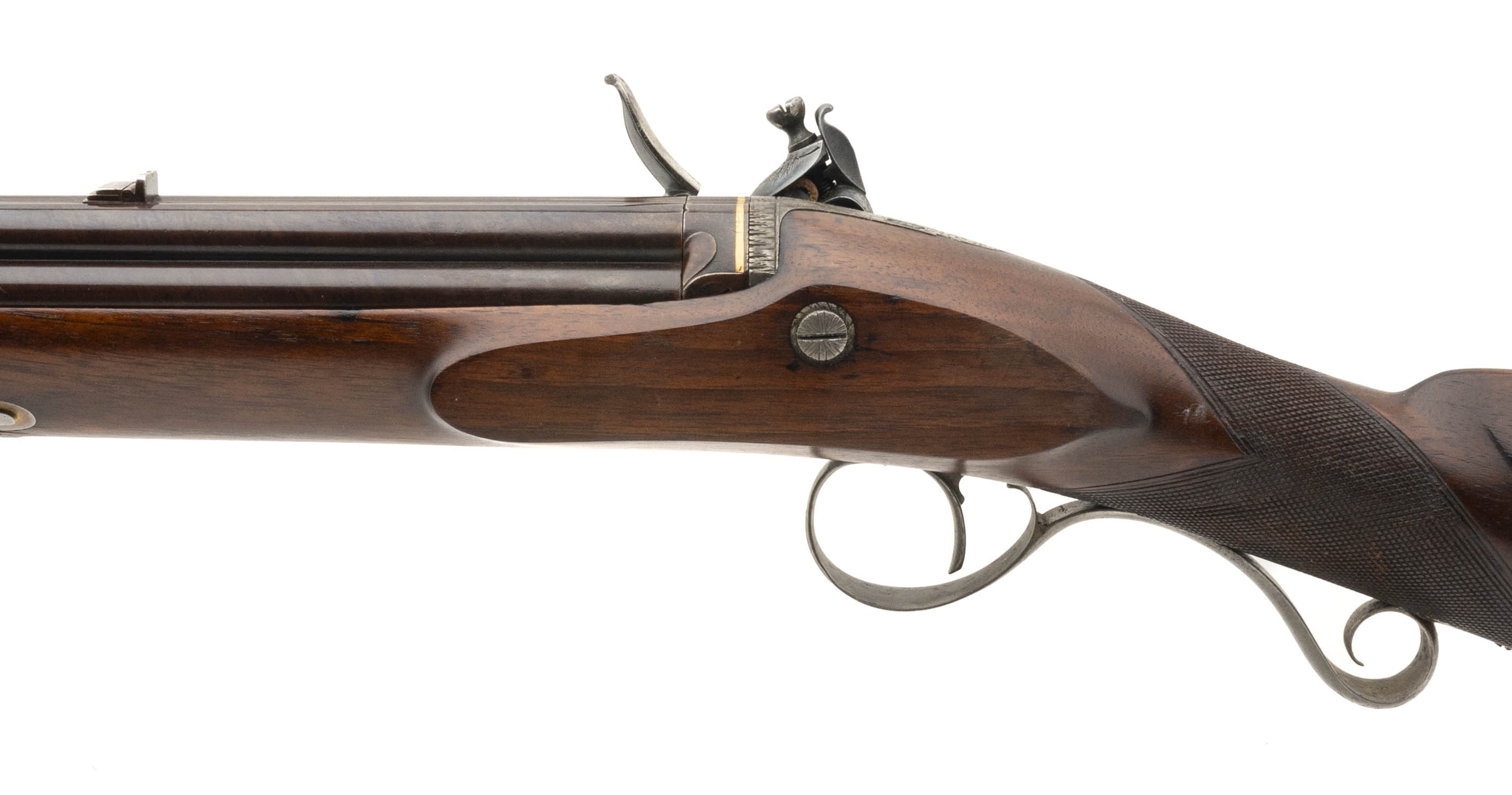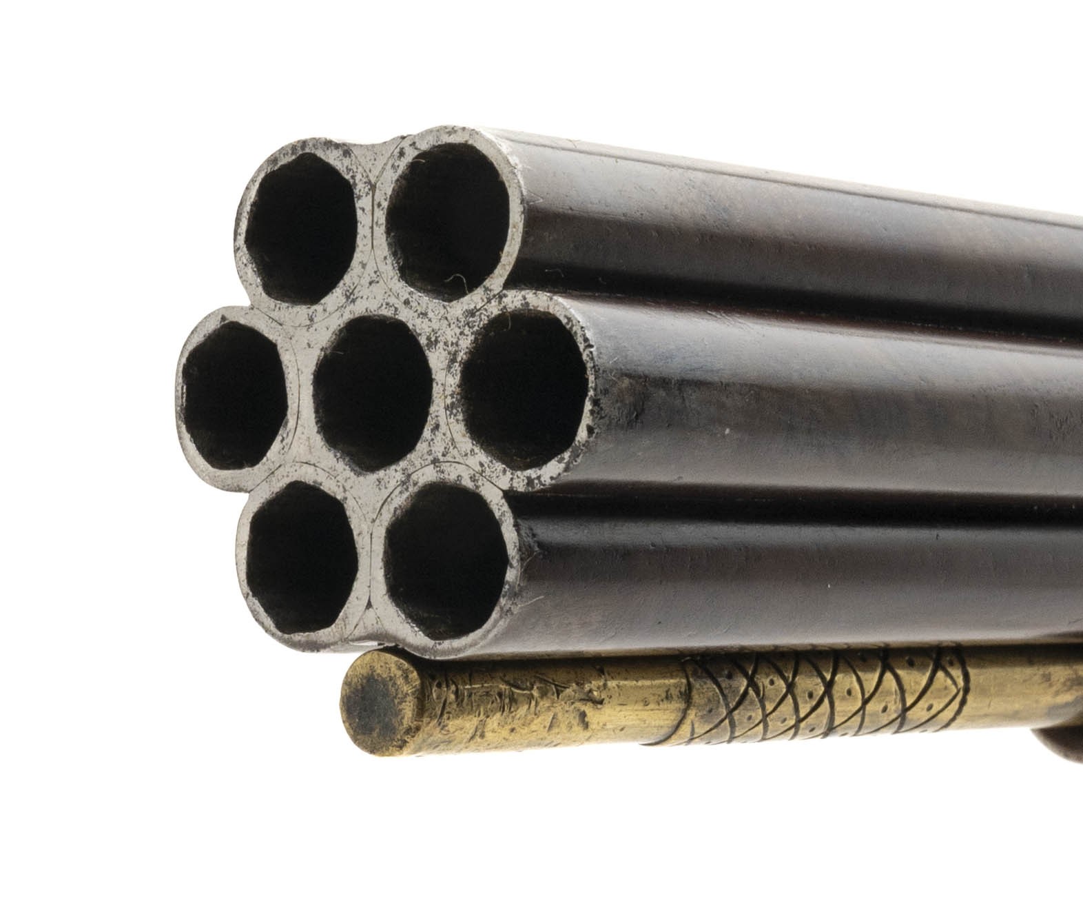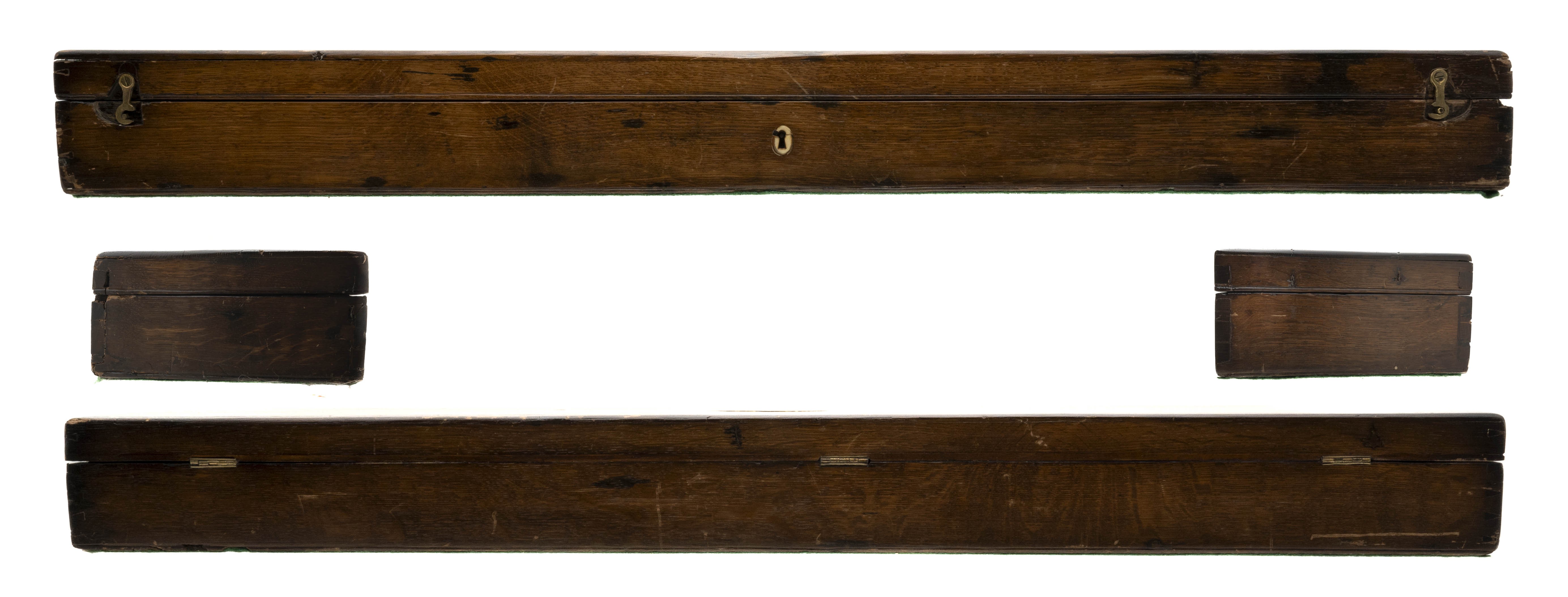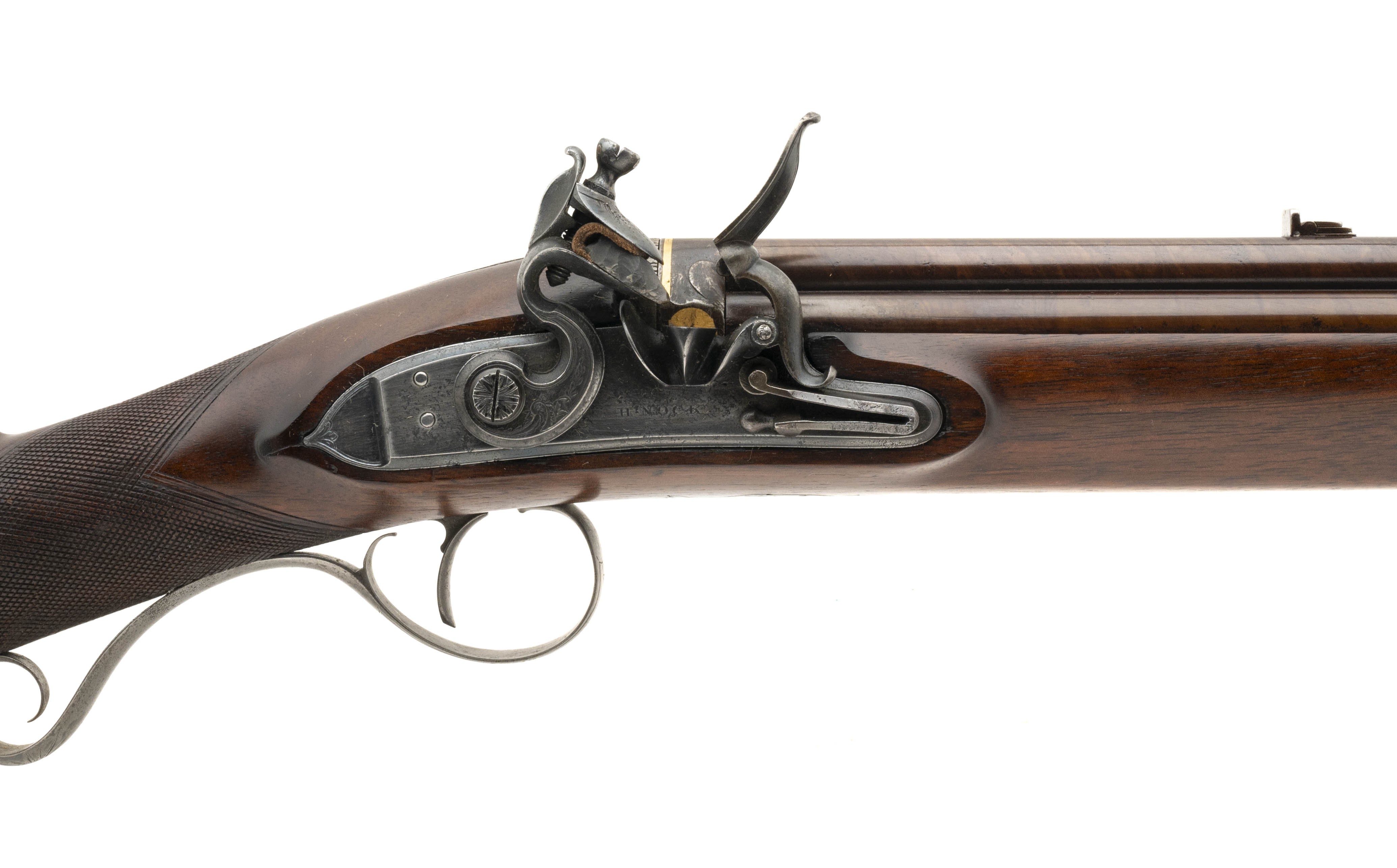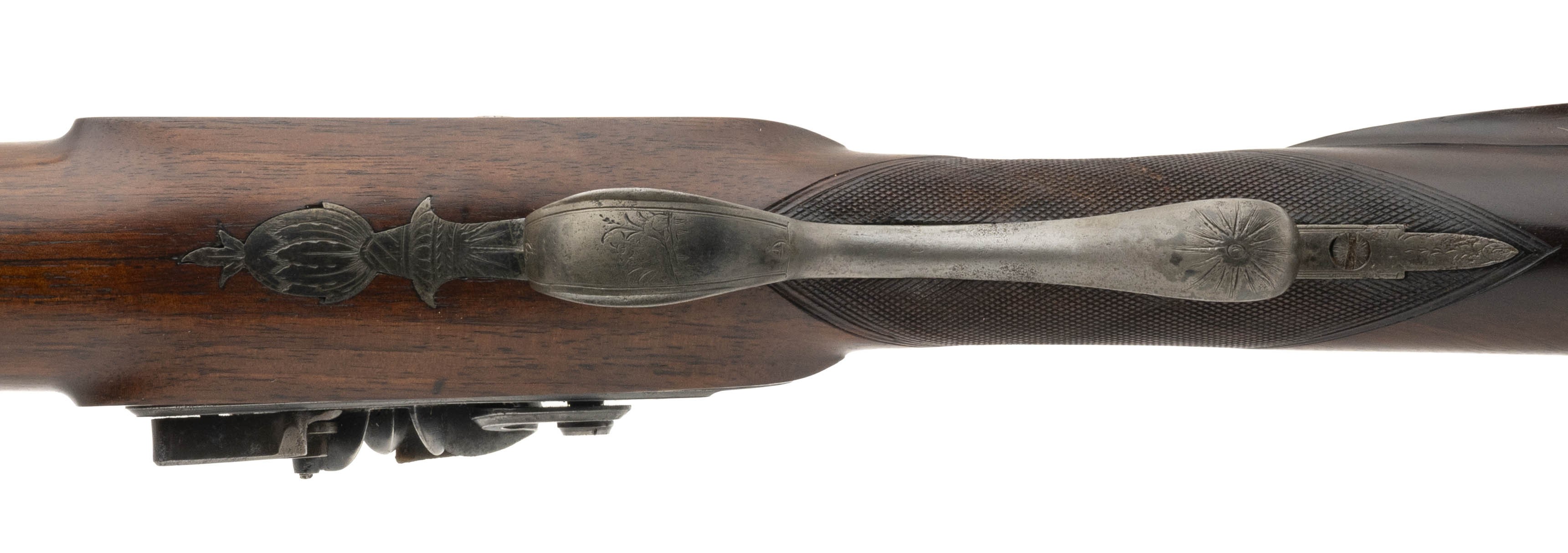NSN. Made circa 1810. 42 caliber with a 7 barrels that measure with a 20” barrels. The barrels have been expertly refinished and are in excellent condition. The stock is excellent as refinished. The action works perfectly. The case is very good with the original lining. The mold has the “H. Knock” marking. The knock is incredibly rare with the 7 spouts. The top of the case lid has a Henry Knock Label. Very neat rare cased gun!
