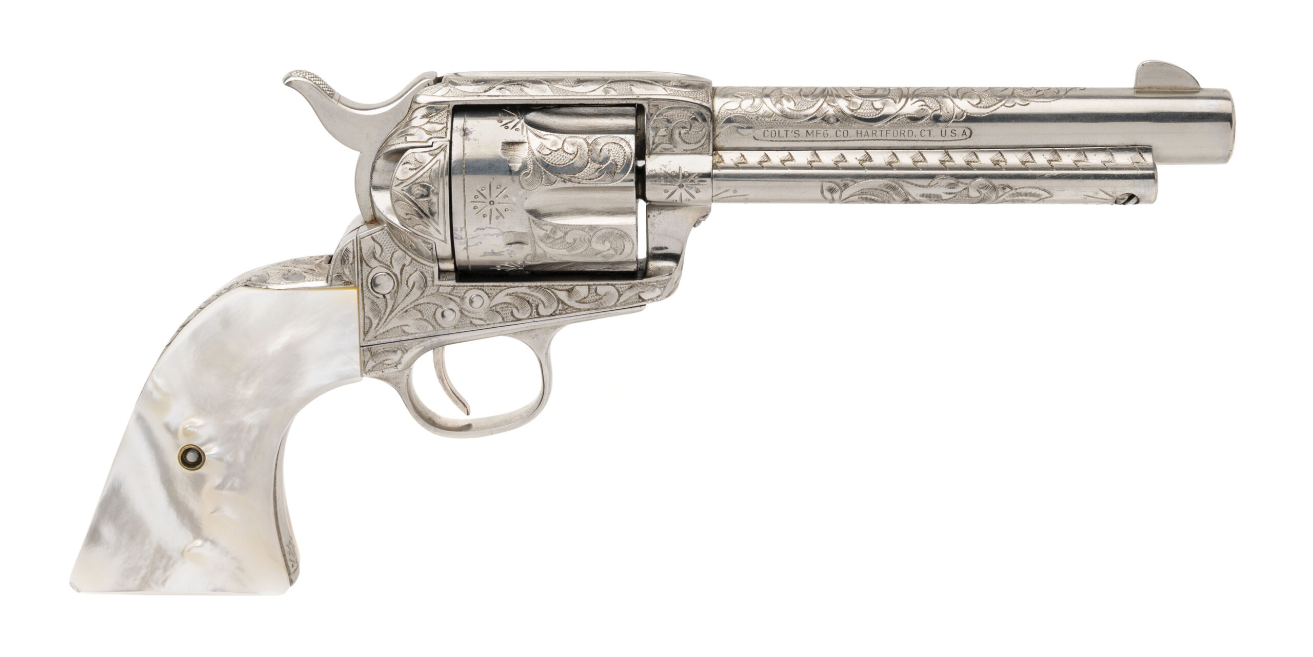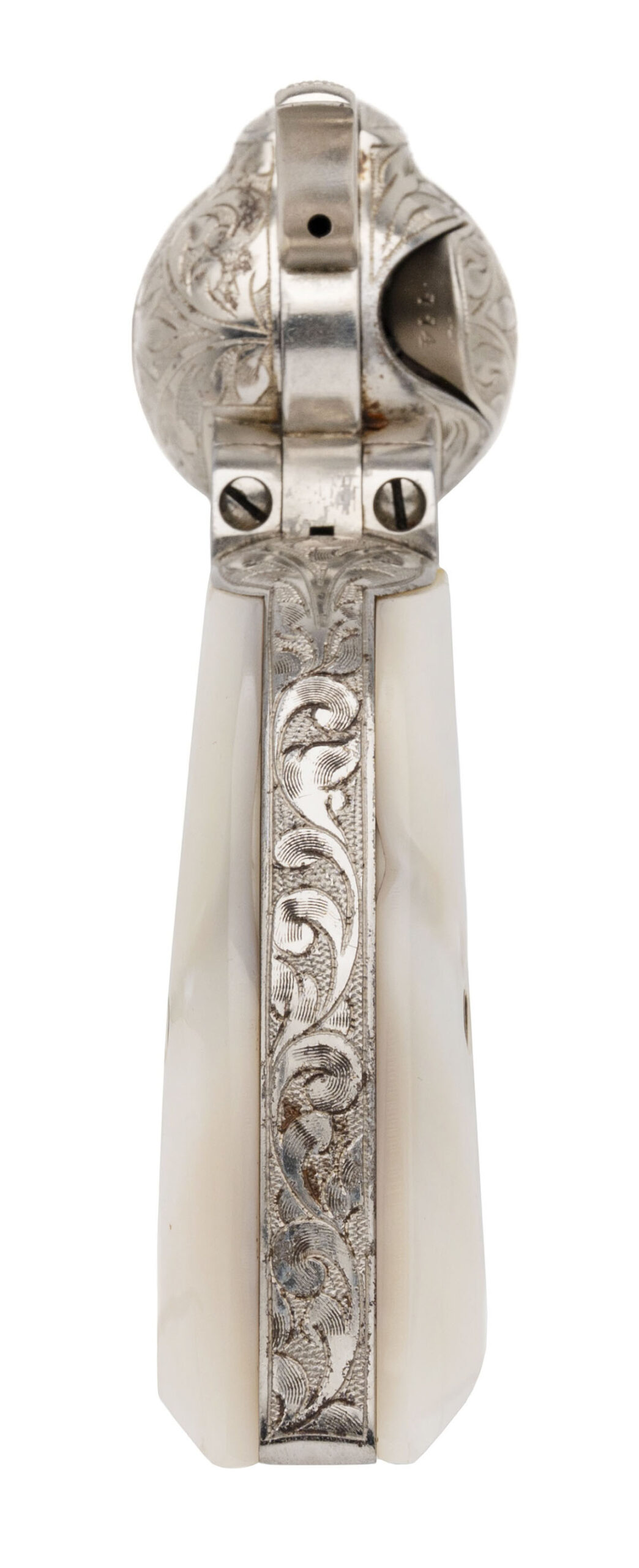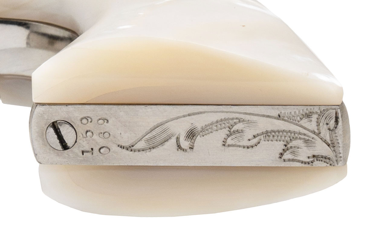 Serial number 159069. Made in 1895. 357 Mag caliber with a 5.5” barrel. This gun is in excellent condition as restored at the time of engraving. The nickel finish rates approximately 98%+. The barrel and cylinder were changed to make this a 357 Mag caliber. The pearl grips are excellent.