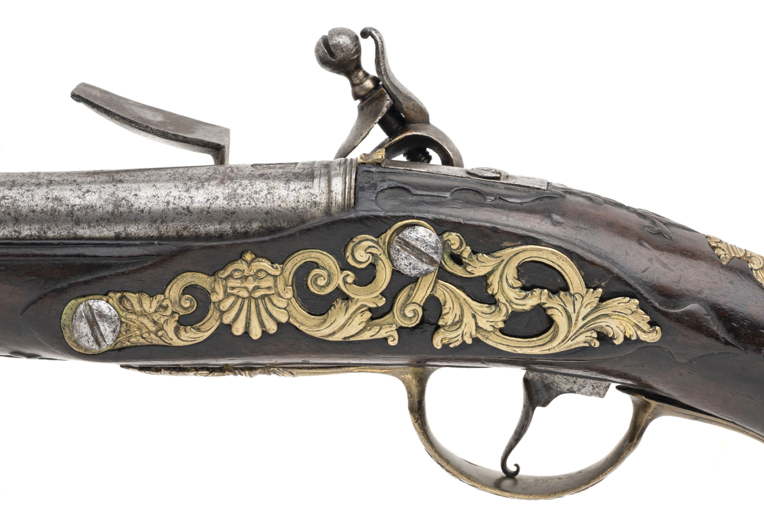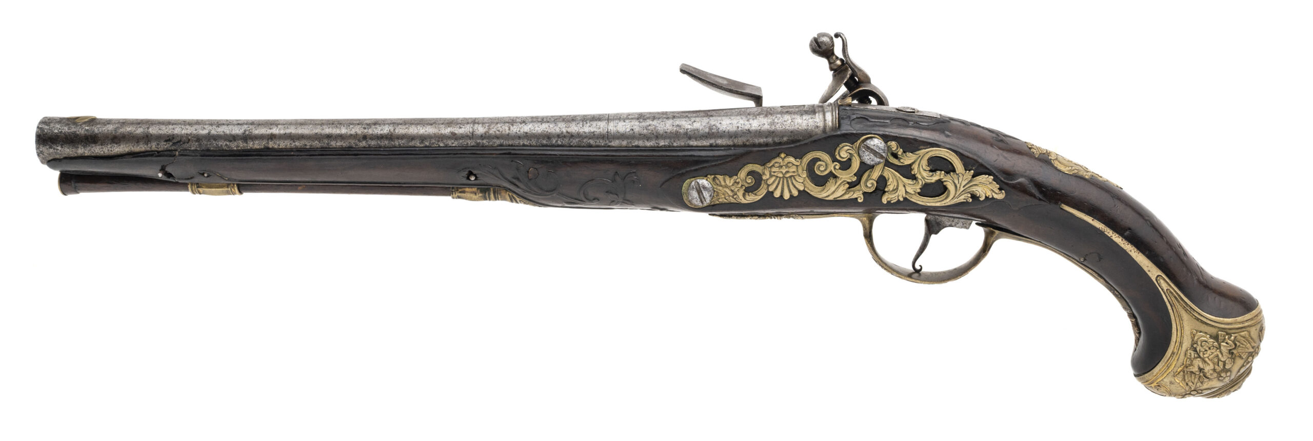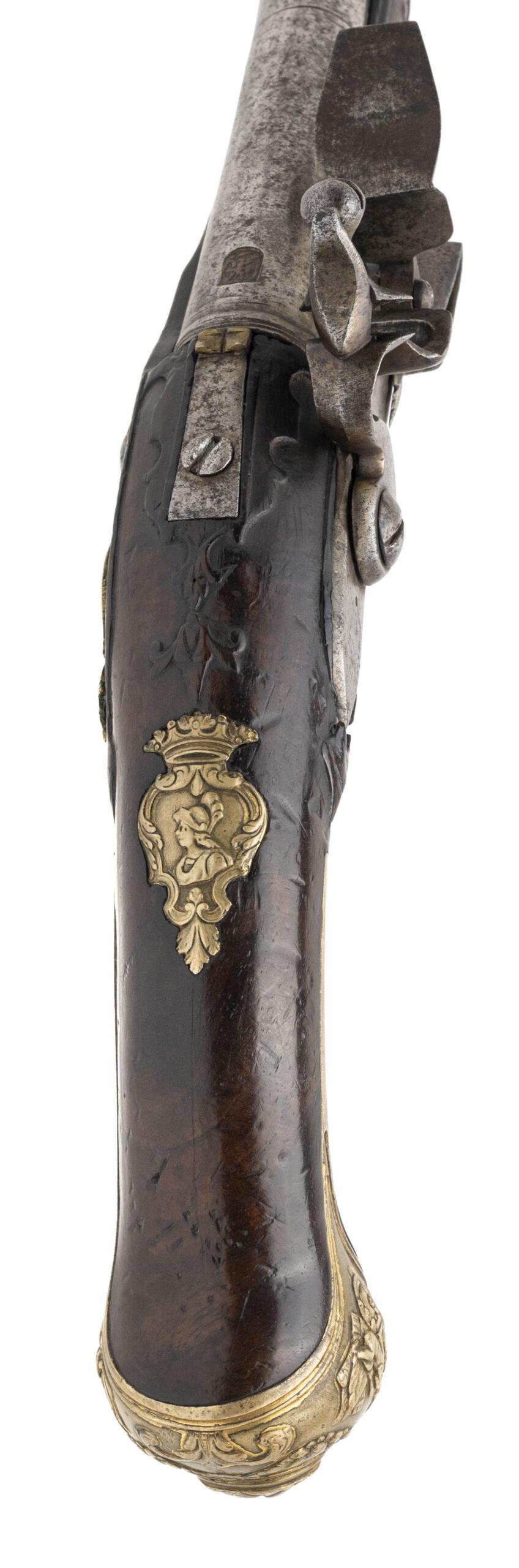 Innsbruck or South Austrian Region A highly attractive and early flintlock pistol of court quality, attributed to the Tyrolean / South Austrian region and dating to approximately circa 1695–1715. This pistol exemplifies the distinctive Central European Baroque aesthetic, combining robust mechanical construction with richly modeled gilt-brass mounts influenced by Italian decorative vocabulary. The heavy forged barrel is octagonal at the breech, transitioning to round, and exhibits a deep, even patina consistent with age. At the breech is an original arched maker’s sink, a private barrel-forger’s stamp typical of South German and Austrian workshops of the period, confirming early manufacture and original assembly. The breech walls are notably thick, with proper early flintlock touch-hole placement. The flat lock plate retains its correct early geometry, with a broad-tailed cock, thick frizzen, and robust internal architecture characteristic of late 17th-century continental flintlocks. The lock remains mechanically correct and unaltered, showing honest wear consistent with age and use. The dark fruitwood stock (likely walnut) is well shaped, with a compact butt and thick wrist typical of Tyrolean pistols and is relieved for ornate gilt-brass mounts. The mounts are finely cast and chased in high relief, featuring a bold grotesque mask pommel, flanked by scrolling foliage and cherub vignettes, all executed in a dense, sculptural Baroque style. Additional mounts include an elegant pierced sideplate, scrolling triggerguard, and a wrist escutcheon depicting a female profile bust within a crowned cartouche—motifs associated with courtly Central European arms of the period. The pistol displays excellent overall integrity, with all major components appearing original and correct to the period. The decoration remains crisp, the stock shows no evidence of later reshaping, and the overall form presents a unified, original arm rather than a composite. This pistol represents a fine example of early Tyrolean flintlock production, made in a cultural crossroads that absorbed Italian Baroque influence while retaining distinctly Germanic mass and mechanical seriousness. Such pistols are scarce, particularly in this state of preservation, and are highly desirable to advanced collectors of early European firearms. A rare and evocative Central European flintlock pistol from the dawn of the 18th century.